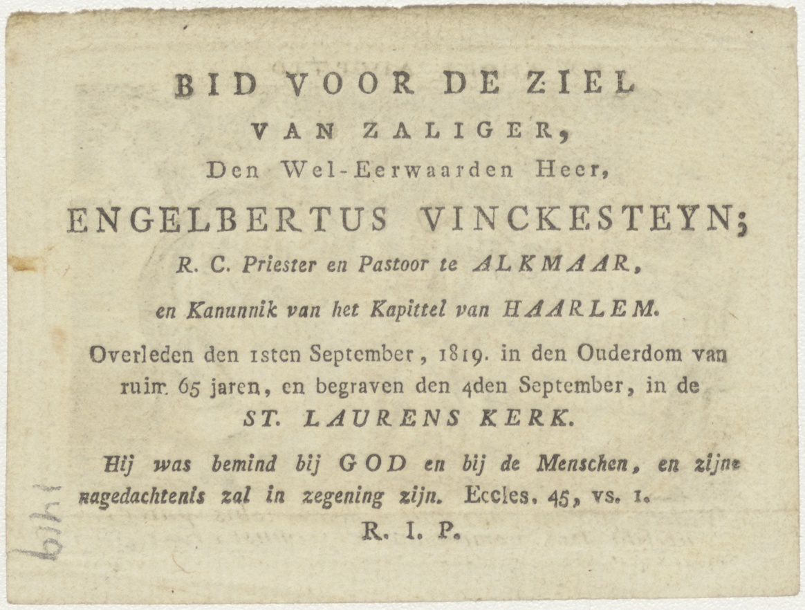 Amor divinus en Anima ontmoeten Christus (1 Joh. 3), kz. Religieus;Bid voor ziel Engelbertus Vinkesteijn (+1819);pastoor Alkmaar kanunnik Haarlem St.;