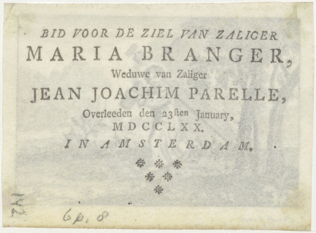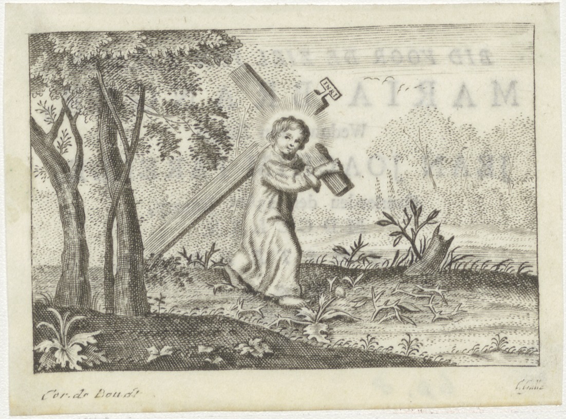Christuskind met kruis, kz. Bid voor ziel van Parelle-Branger (+1770);Amsterdam;