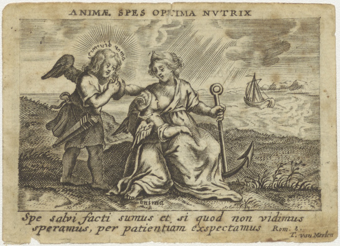 Amor divinus en Anima, Anima krijgt borstvoeding van vrouw (Hoop), twee engeltjes, kz. Bid voor ziel Renard-Schuman (+1824);Amsterdam;