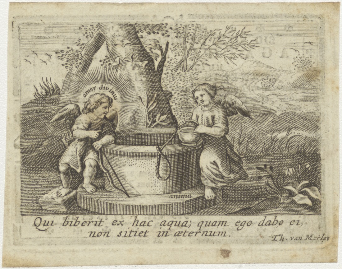 Amor divinus en Anima bij put, twee engeltjes, kz. Bid voor ziel Sommers-Leep (+1826);Zoeterwoude;