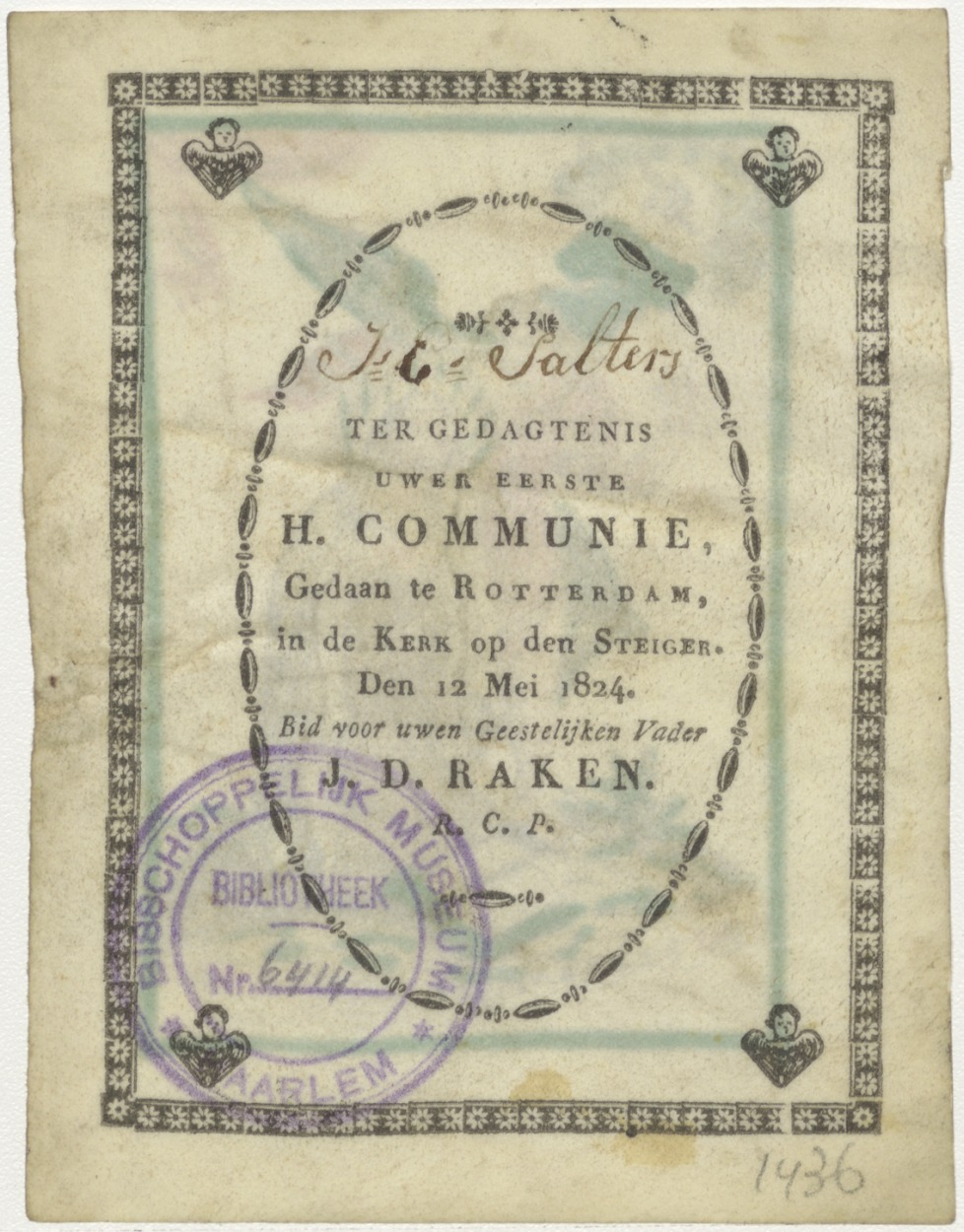 H. Francisca Romana, ingekleurd, kz. H. Communie Salters;1824;De Steiger;Rotterdam;pastoor J.D. Raken;