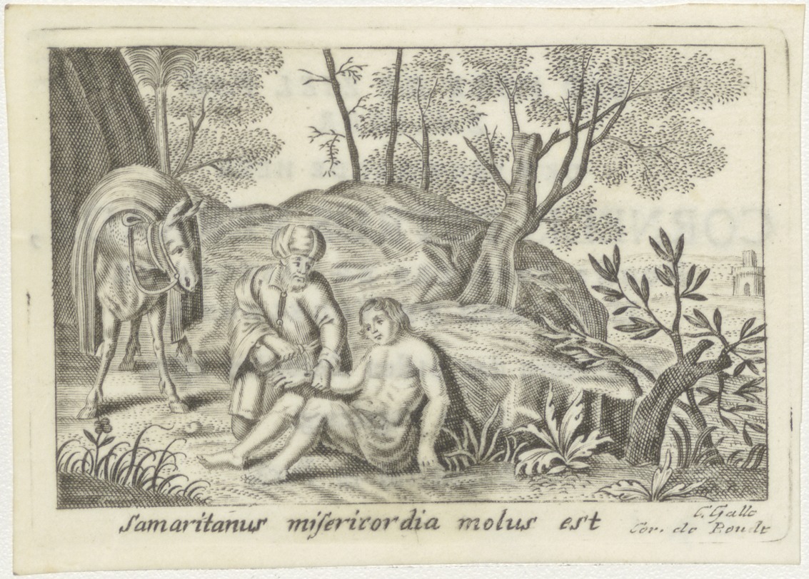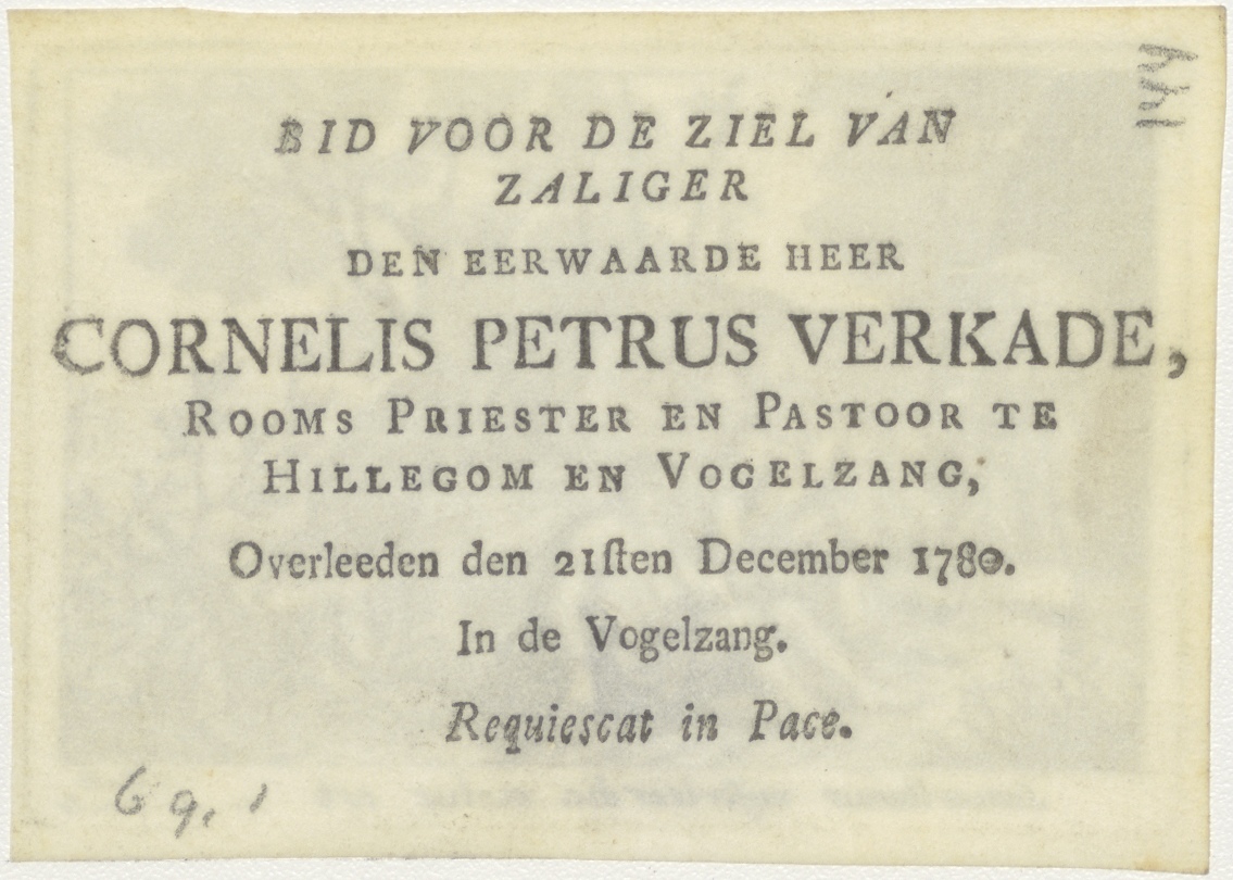 Barmhartige Samaritaan, kz. Religieus;Bid voor ziel Cornelis Petrus Verkade (+1780);rooms priester te Hillegom en Vogelzang