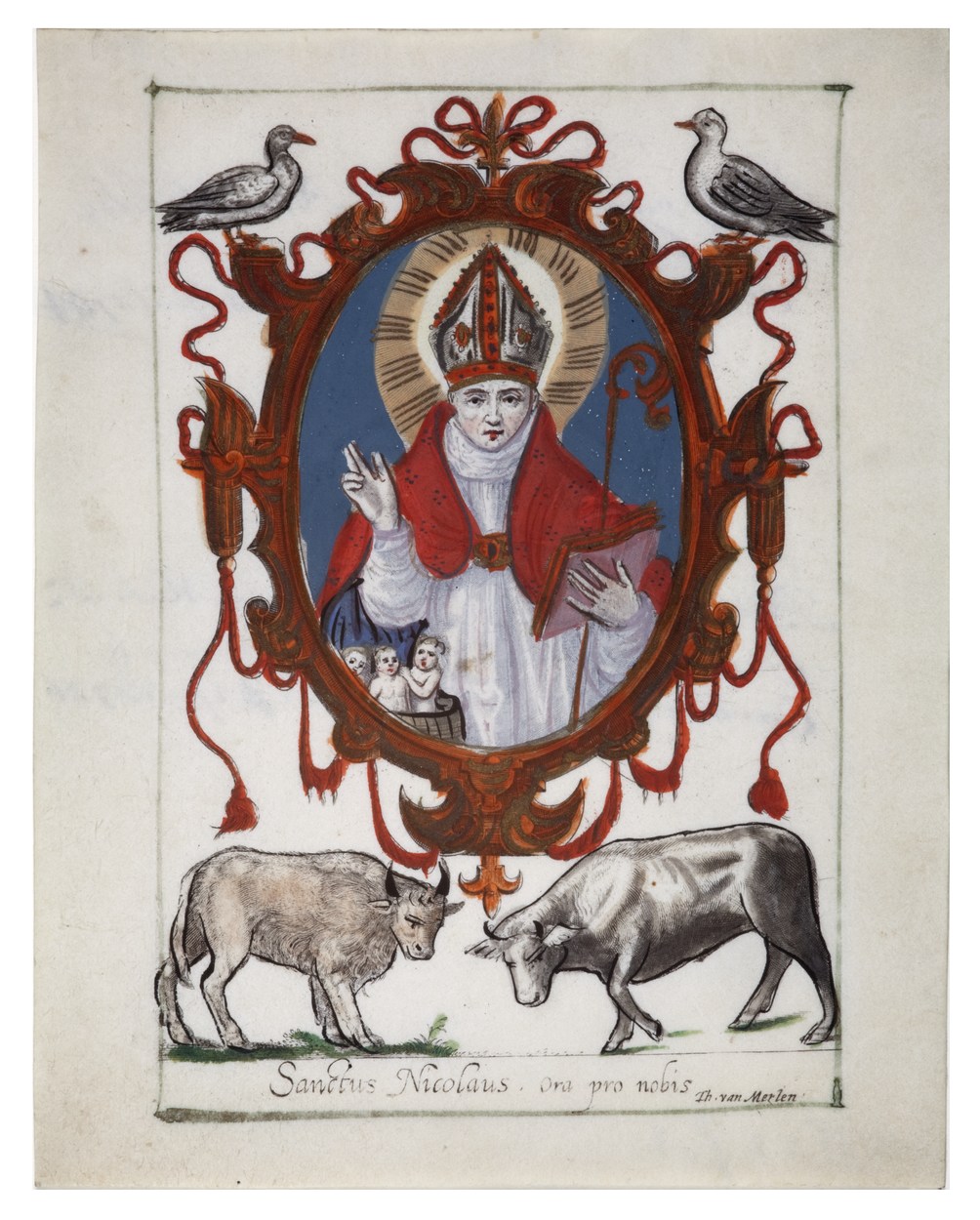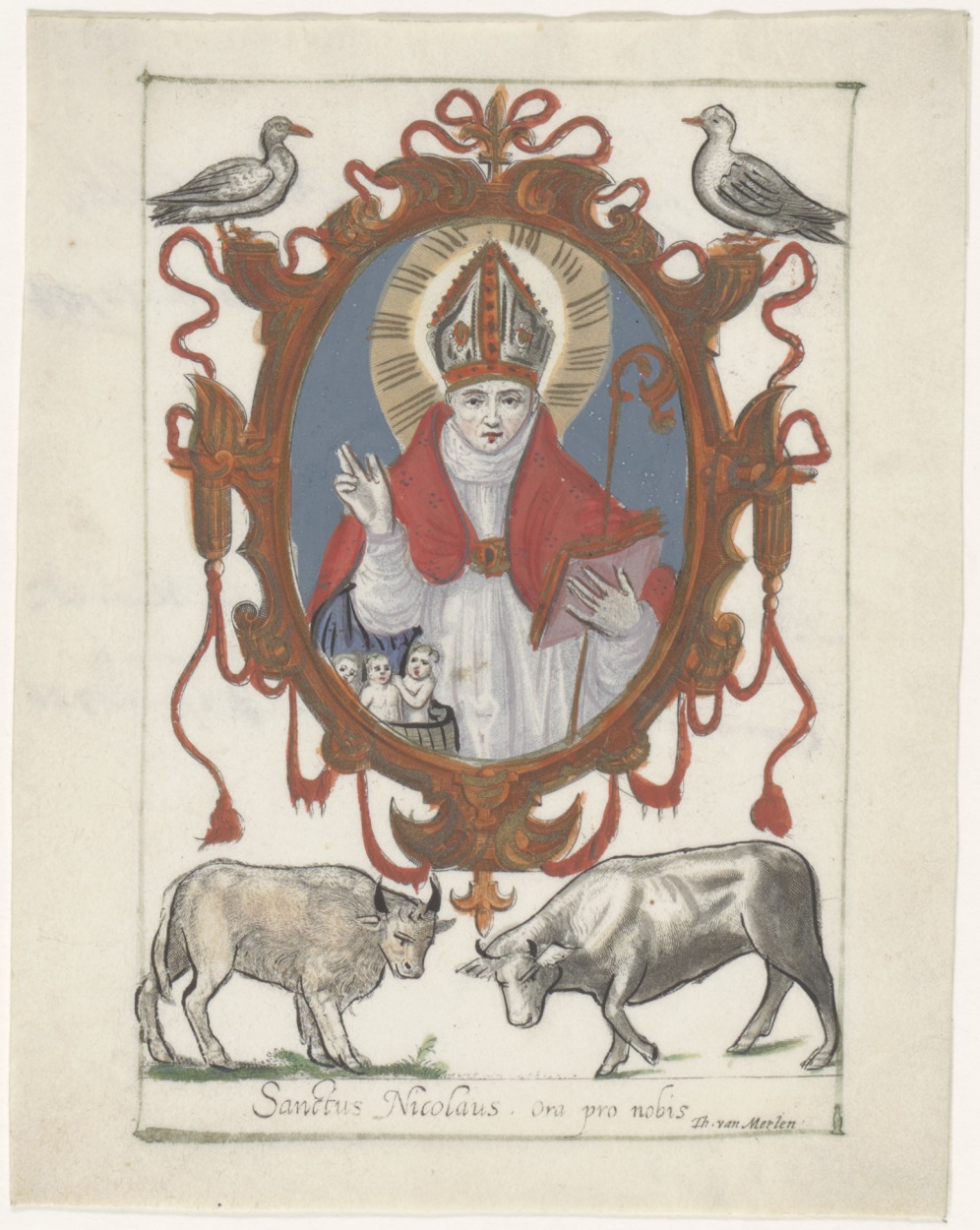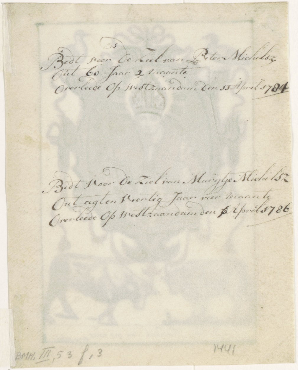 H. Nicolaus, (Nicolaas), ingekleurd, kz. dubbelgebruik;Bid voor ziel Michilsz (+1784);Bid voor ziel Michilsz (+1786);