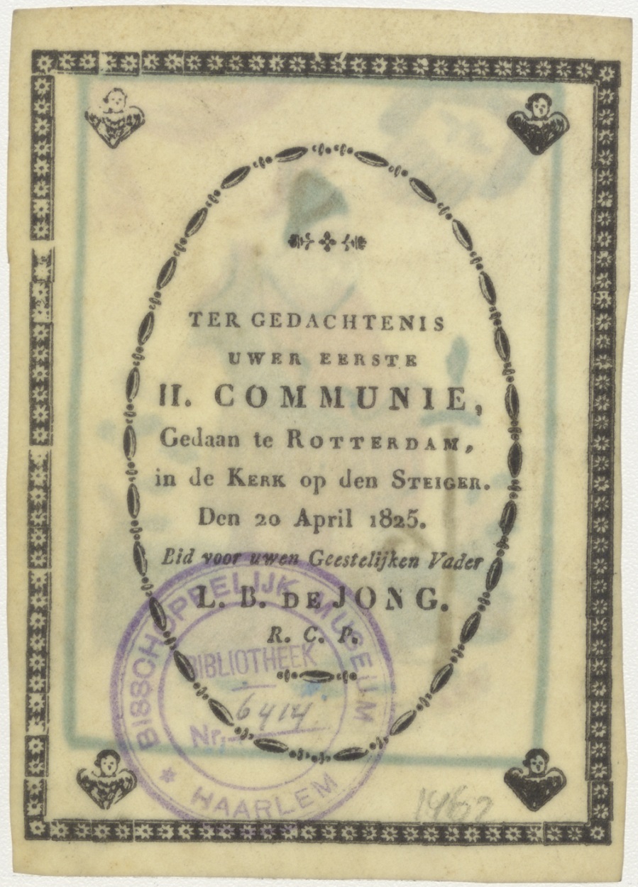 H. Adrianus, ingekleurd, kz. H. Communie door pastor L.B. de Jong;Rotterdam;Kerk op den Steyer;