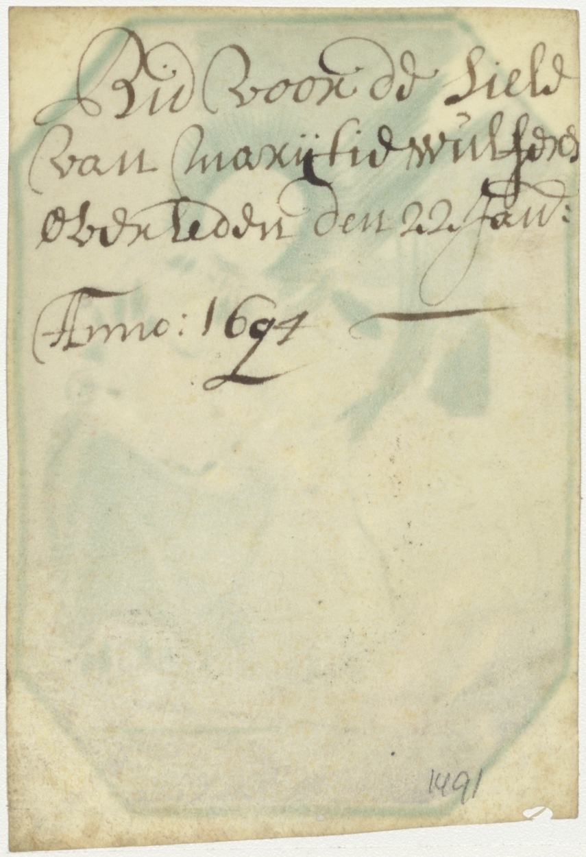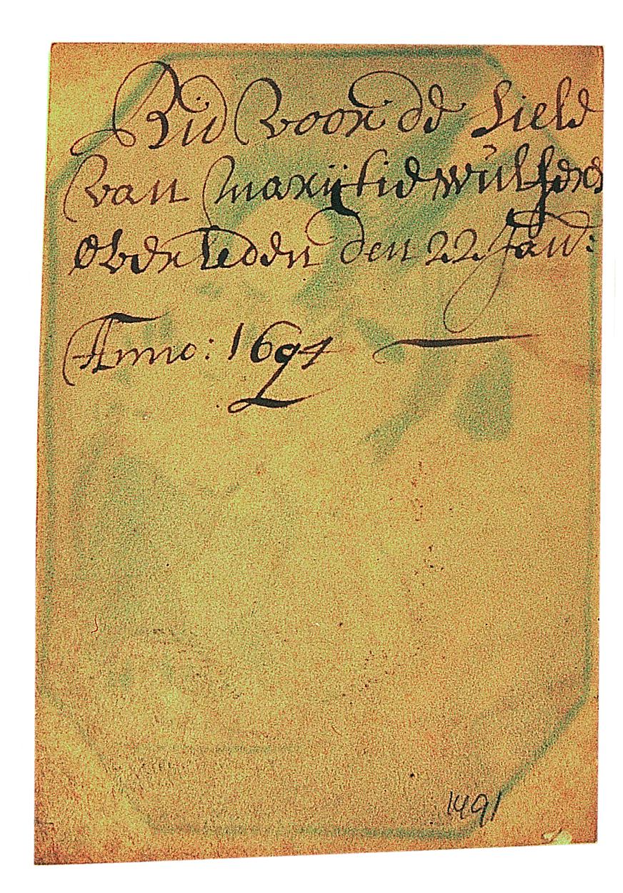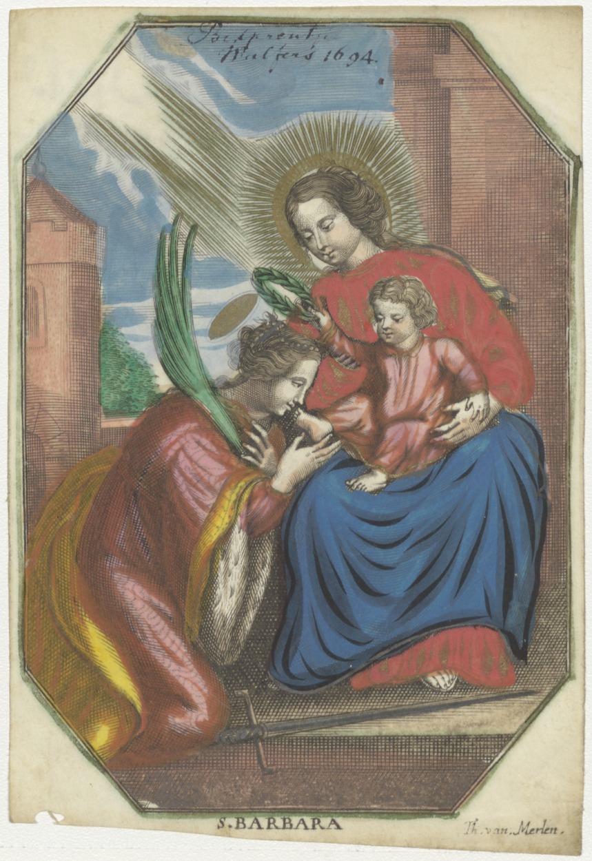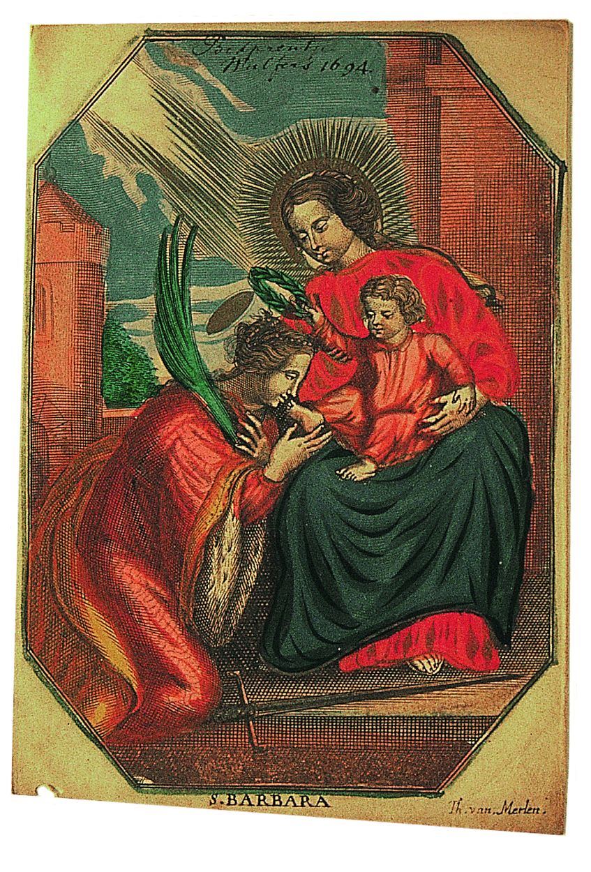H. Barbara met Maria en Christuskind, ingekleurd, kz. Bid voor ziel Marijtje Wulfers (+1694)
