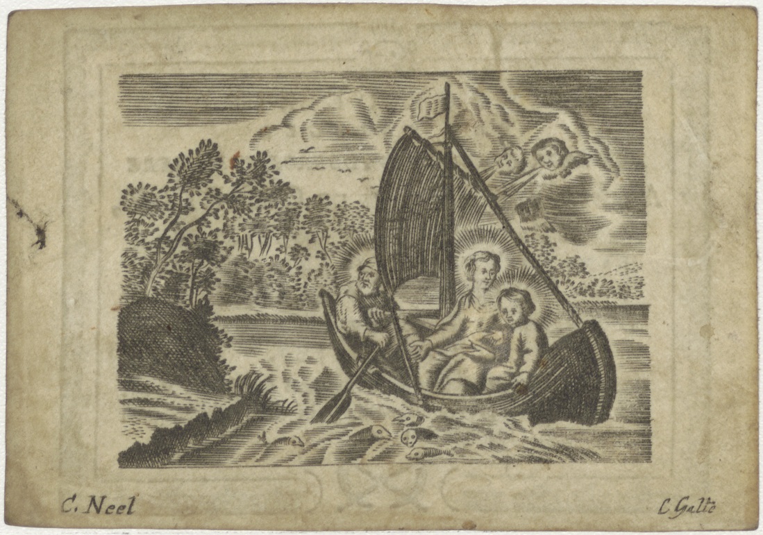 H. Familie in bootje tijdens vlucht naar Egypte, kz. Religieus;Bid voor ziel Aymericus van der Capelle (+1787);aartspriester Holland;pastoor Amsterdam;