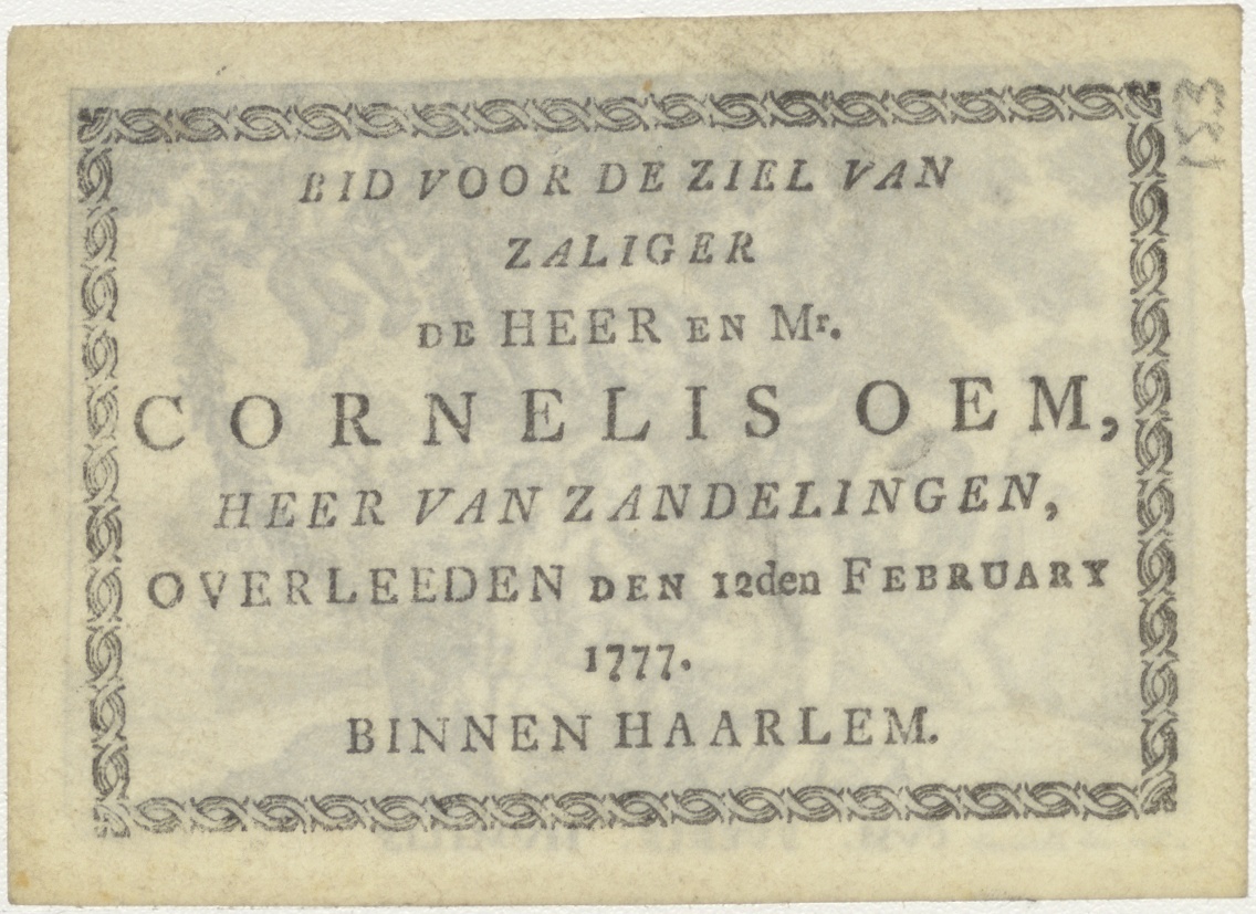 Maria met Christuskind en Johannes, kz. Bid voor ziel Oem heer van Zandelinge (+1777);Haarlem;