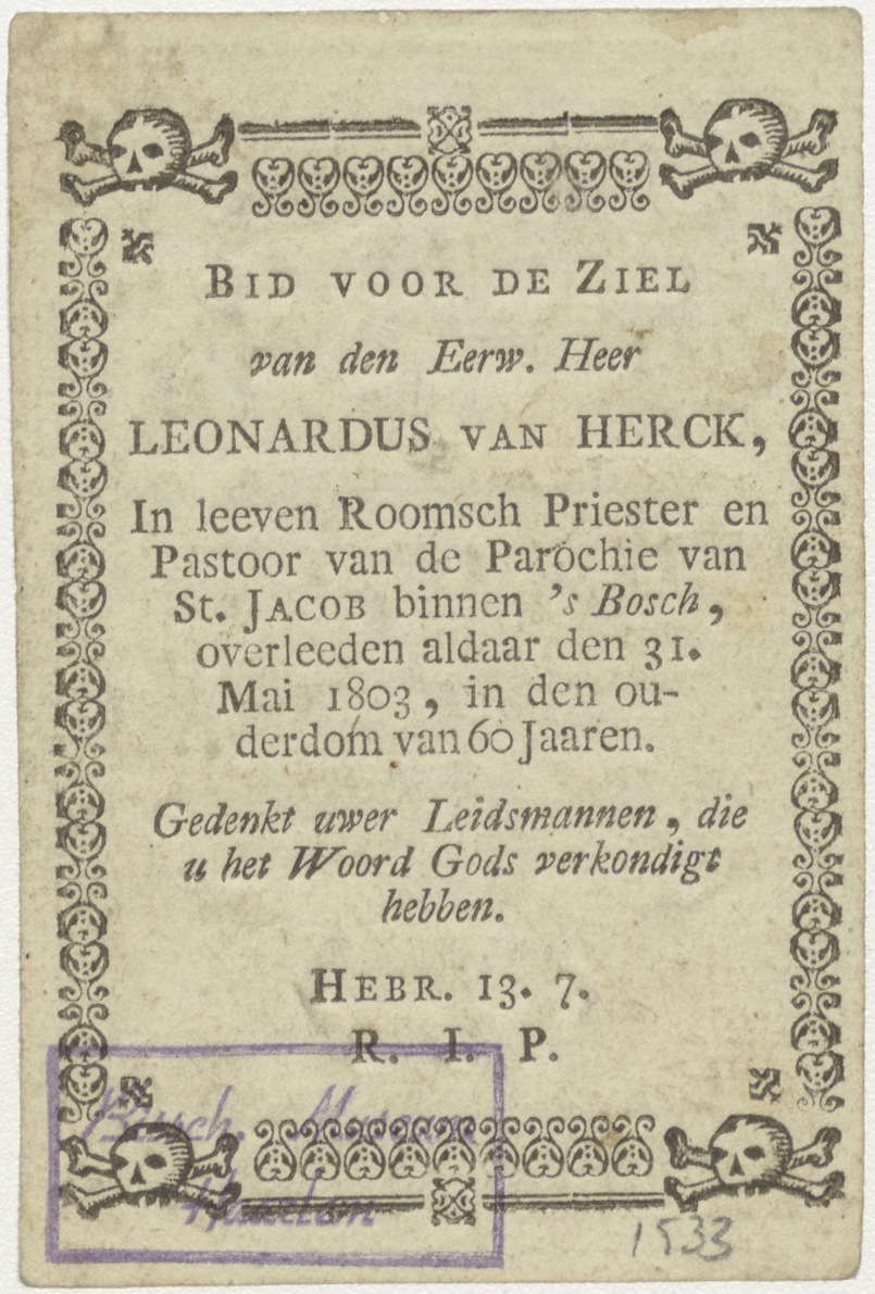 Passiescène, kruisafneming van Christus, kz. Religieus;Bid voor ziel Leonardus van Herck (+1803);pastoor St. Jacob;Den Bosch;