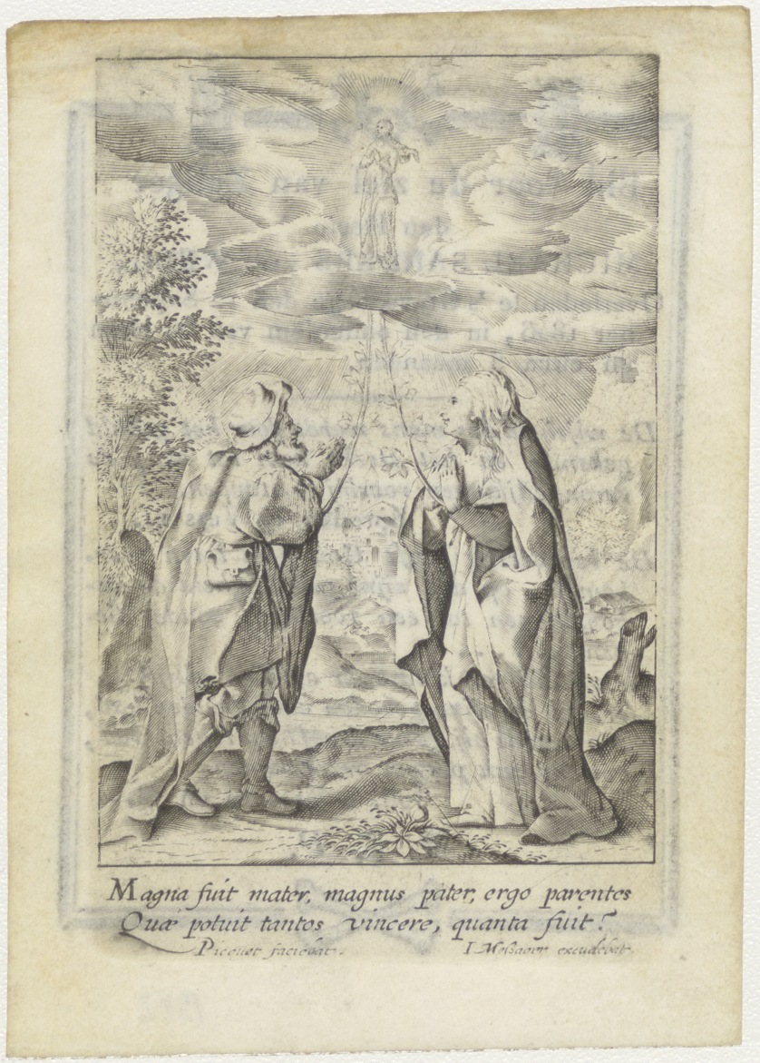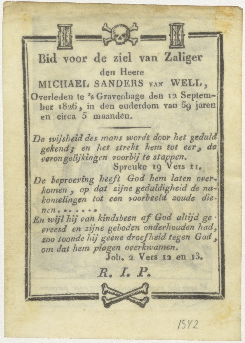 Man en vrouw aanbidden Maria in de hemel, kz. Bid voor ziel Sanders van Well (+1826);Den Haag;