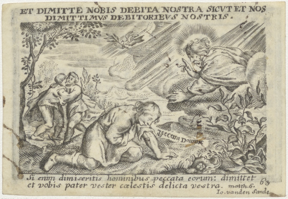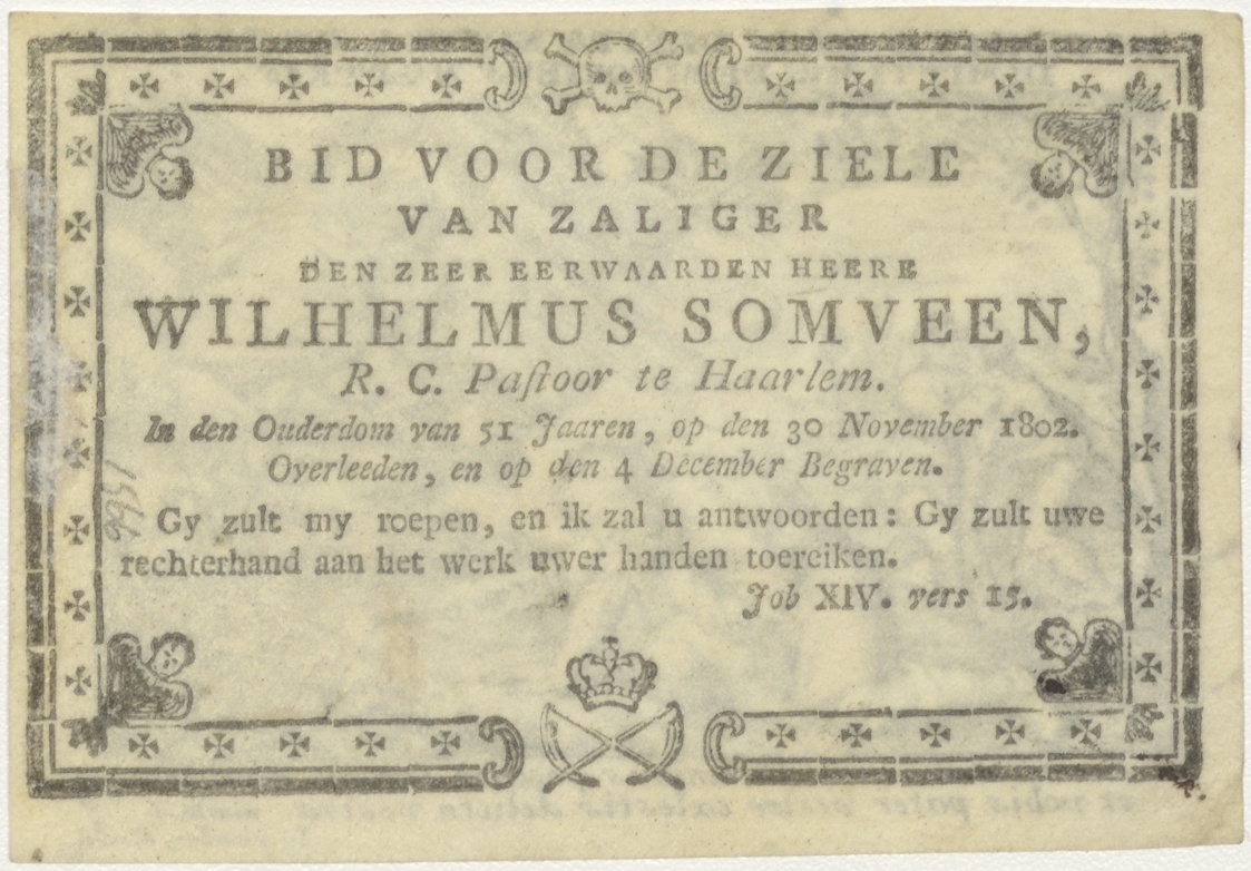 God spreekt iemand toe, twee personen op achtergrond (Math.6), kz. Religieus;Bid voor ziel Wilhelmus Somveen (+1802);pastoor te Haarlem;