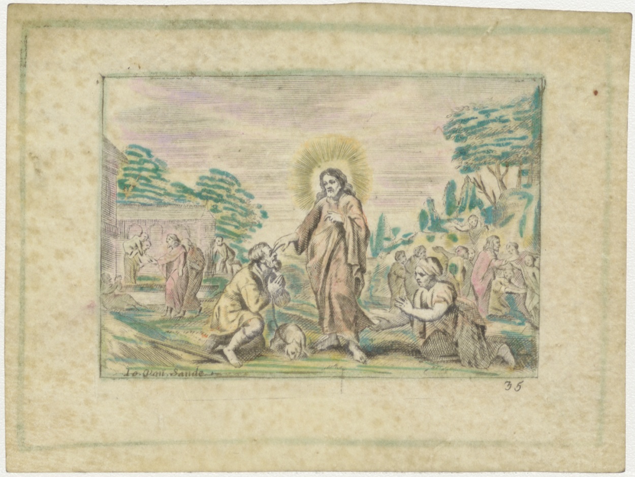 Wonderen van Christus, vrouw die de mantel van Christus aanraakt, ingekleurd