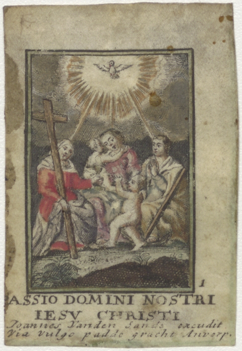 Passiescène (serie), Christus, 1, geboorte van Christus(?) met Maria, Johannes, Elisabeth, etc., ingekleurd