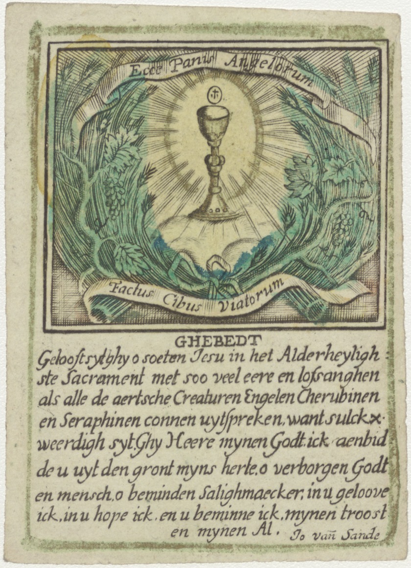 Aanbidding van het H. Sacrament, met kelk en gebed, ingekleurd