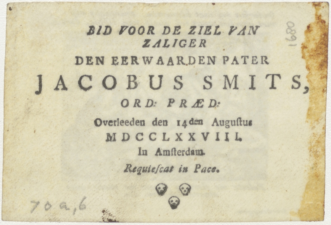 Bron van liefde (Cant.2), vrouwen, kz. Religieus;Bid voor ziel Jacobus Smits (+1776);orde predikheren Amsterdam;