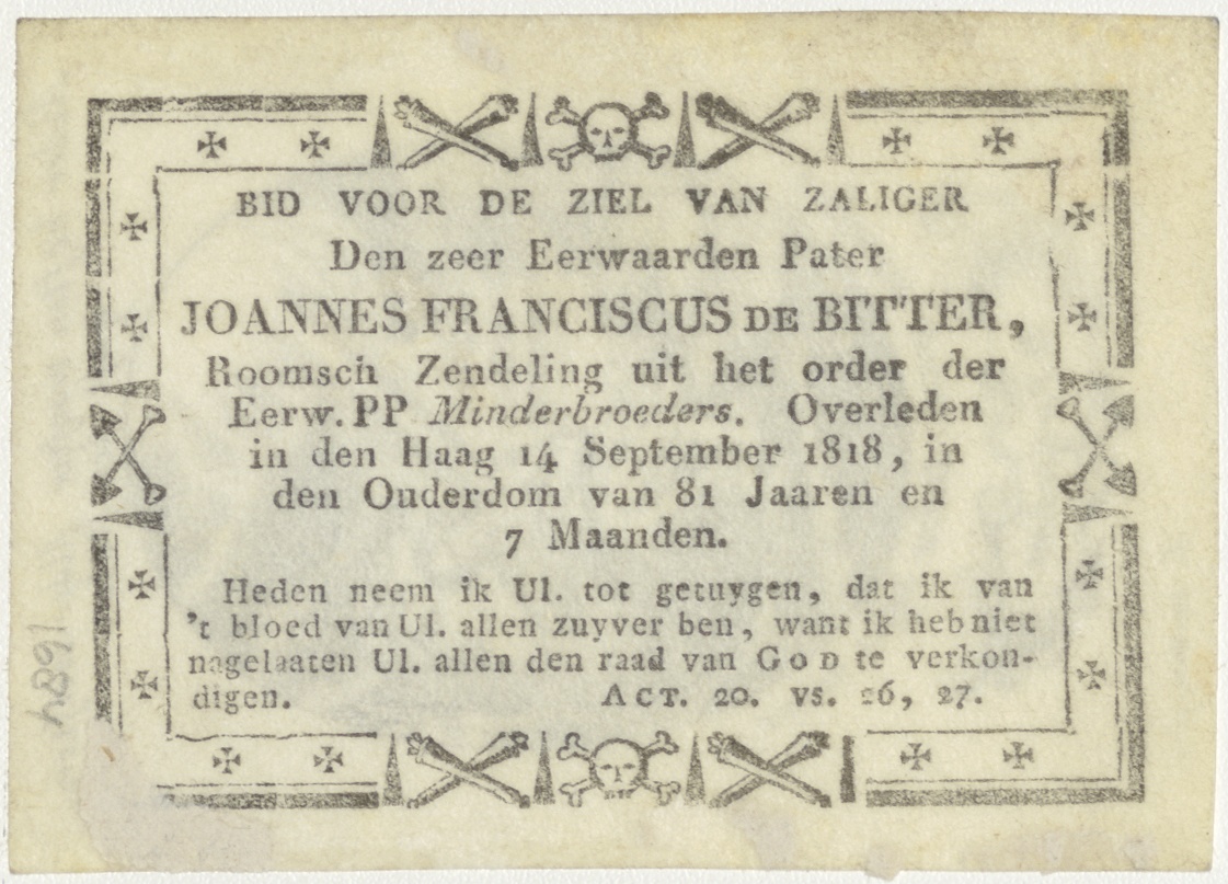 D. Fortitudinis (4), H. Geest, kz. Religieus;Bid voor ziel Joannes Franciscus de Bitter (+1818), Den Haag, minderbroeder