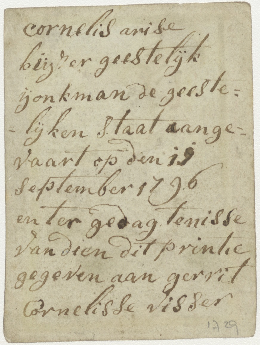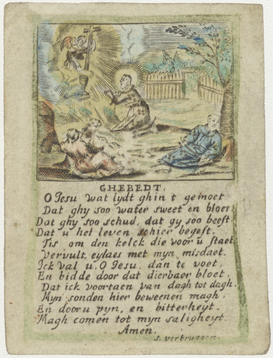 Christus biddend in de tuinen van Getsemané, met gebed, ingekleurd, kz. Religieus;Cornelis Heyzer(?);geestelijk jonkman;geworden 1796;aan Visser;