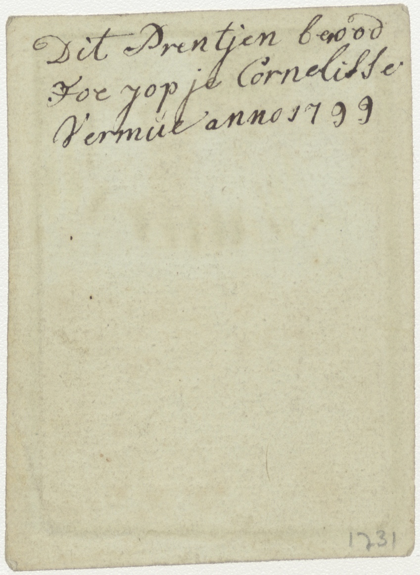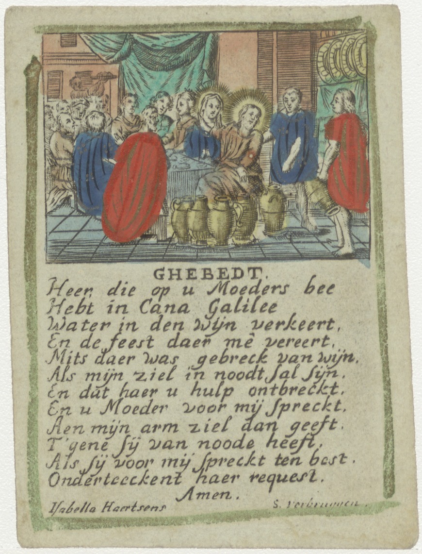 Wonder op de bruiloft te Canaan, met Christus en Maria, ingekleurd, met "Ghebedt Heer die op u Moeders bee Hebt in Cana Galilee ...", kz. Jopje Cornelisse Vermue 1799;