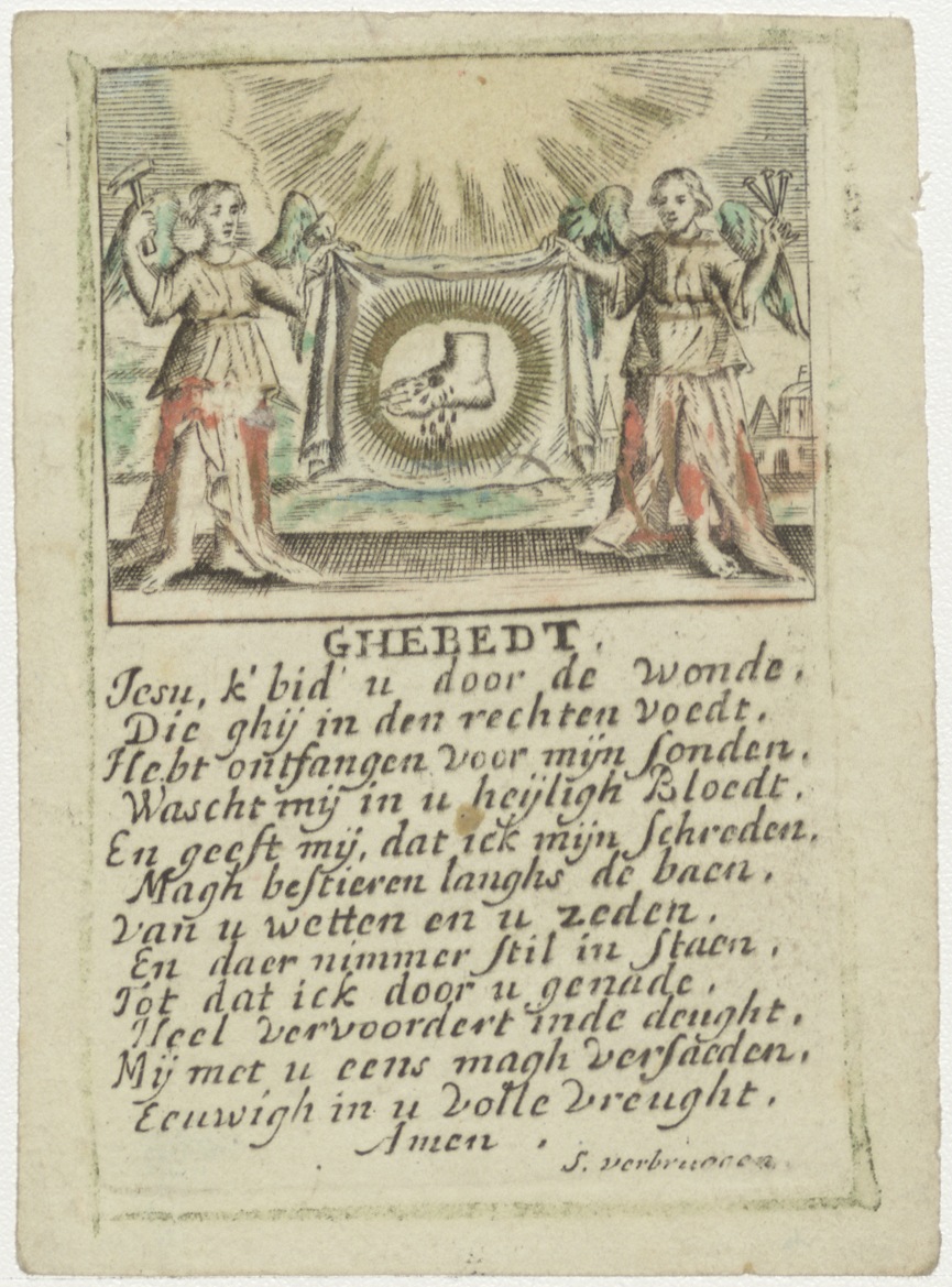 Twee engelen met lijkwade van Christus waarop voet, met gebed (Veronicadoek)