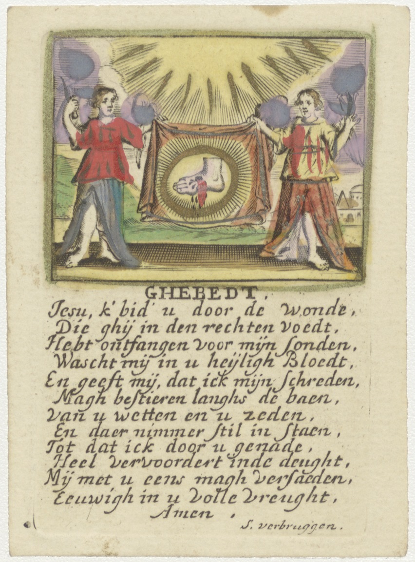 Twee engelen met lijkwade van Christus waarop voet, met gebed (Veronicadoek), ingekleurd
