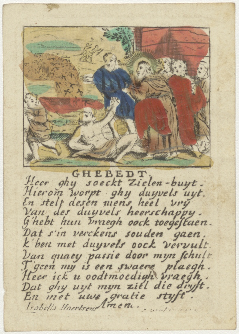 Christus drijft duivels uit bij man, met "Ghebedt Heer ghij soeckt zielen-buyt. Hierom worpt ghij duijvels uijt. ..."