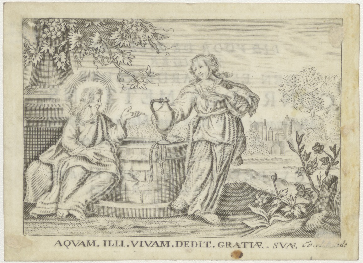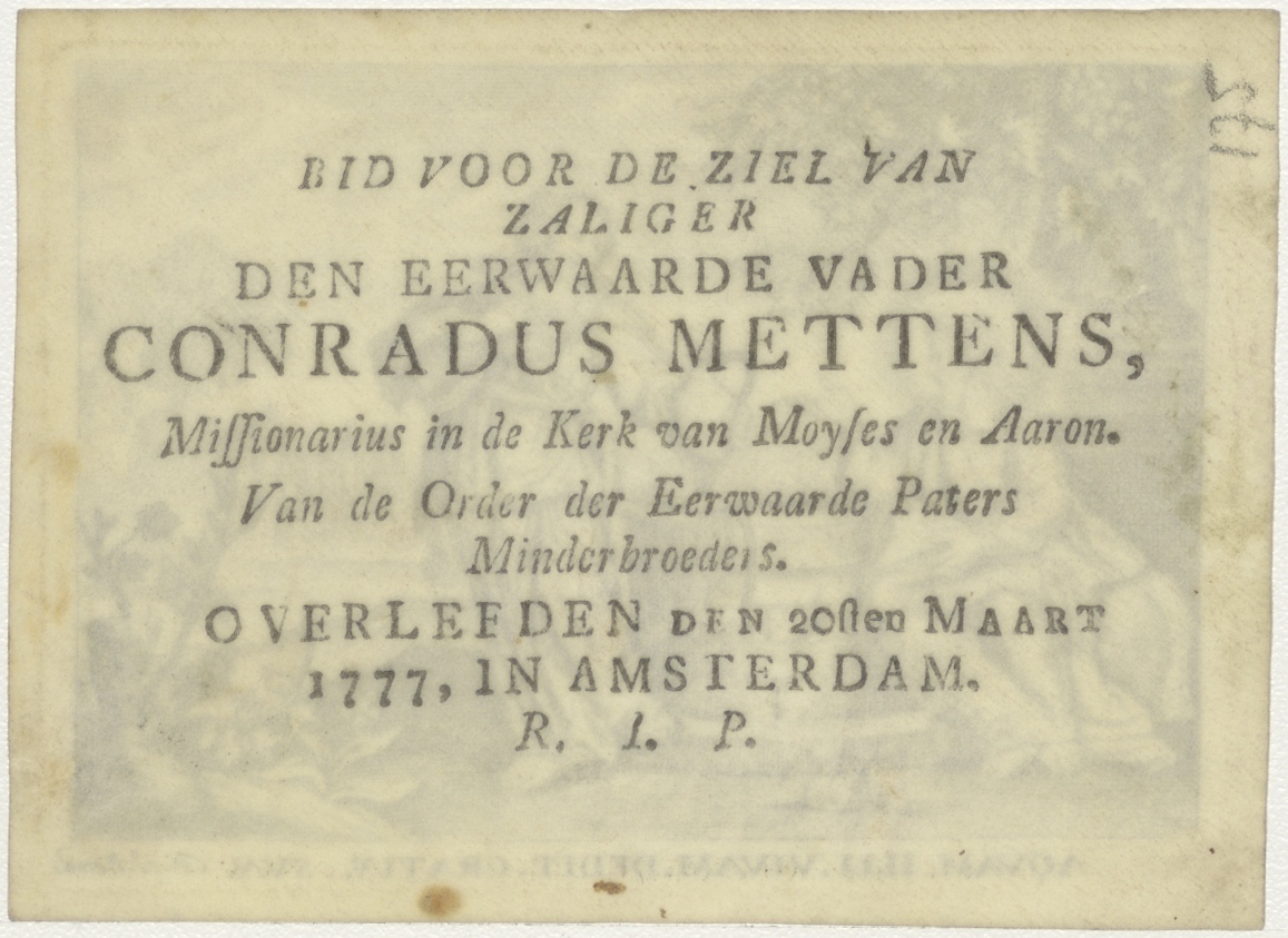 Vrouw aan put geeft man (Christus?) te drinken, kz. Religieus;Bid voor ziel Conradus Mettens (+1777); missionaris Mozes en Aaron Amsterdam;