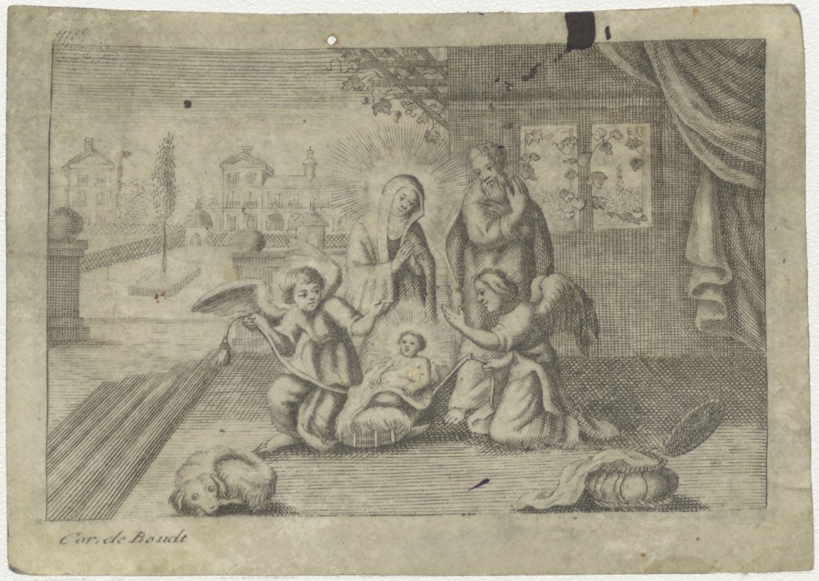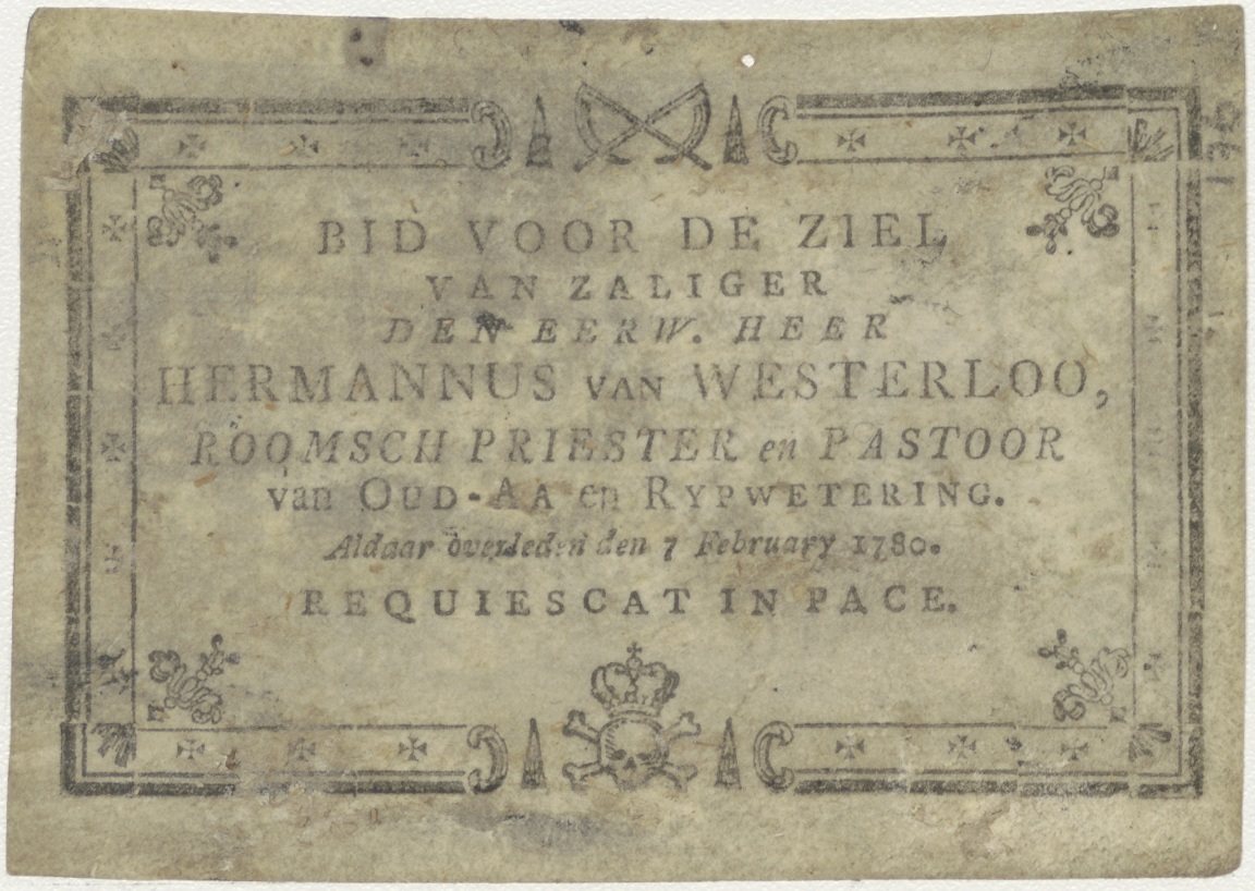 H. Familie, Christuskind gewiegd door twee engelen, kz. Religieus;Bid voor ziel Westerloo (+1780);R.K. pastoor Oud-Aa;Rijpwetering;