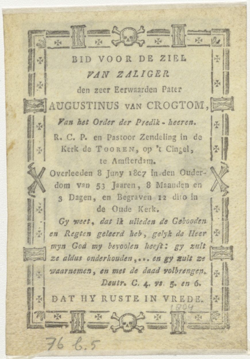 Wonder van twee Jezuïetenpriesters, kz. Religieus;Bid voor ziel Augustinus van Crogtom (+1807);pastoor de Tooren op 't Singel;Amsterdam;