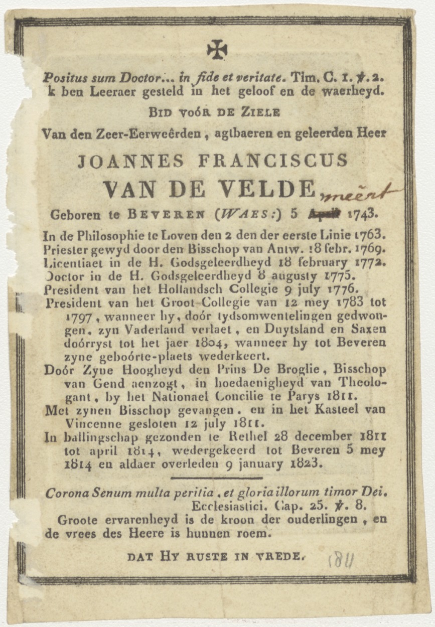 Christus met Maria en Johannes, kz. Religieus;Bid voor ziel Joannes van de Velde (+1823);Bisschop van Gent;