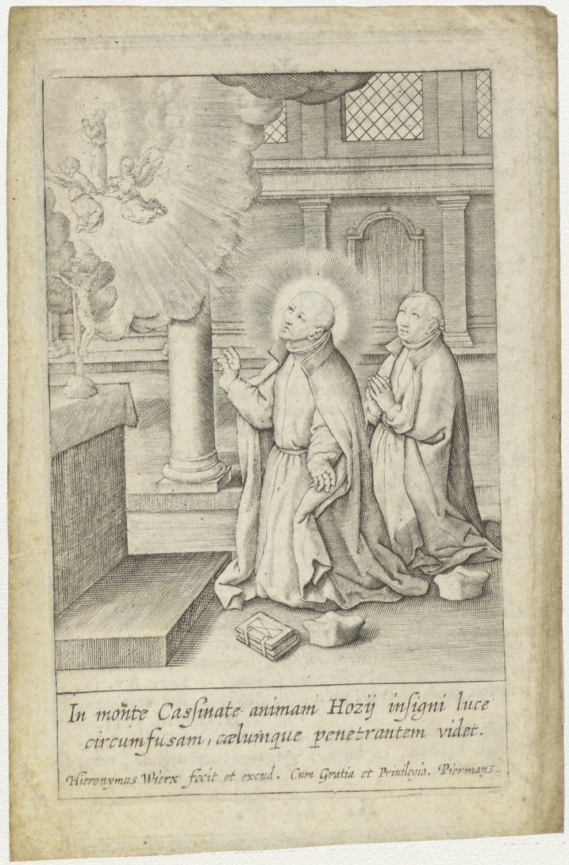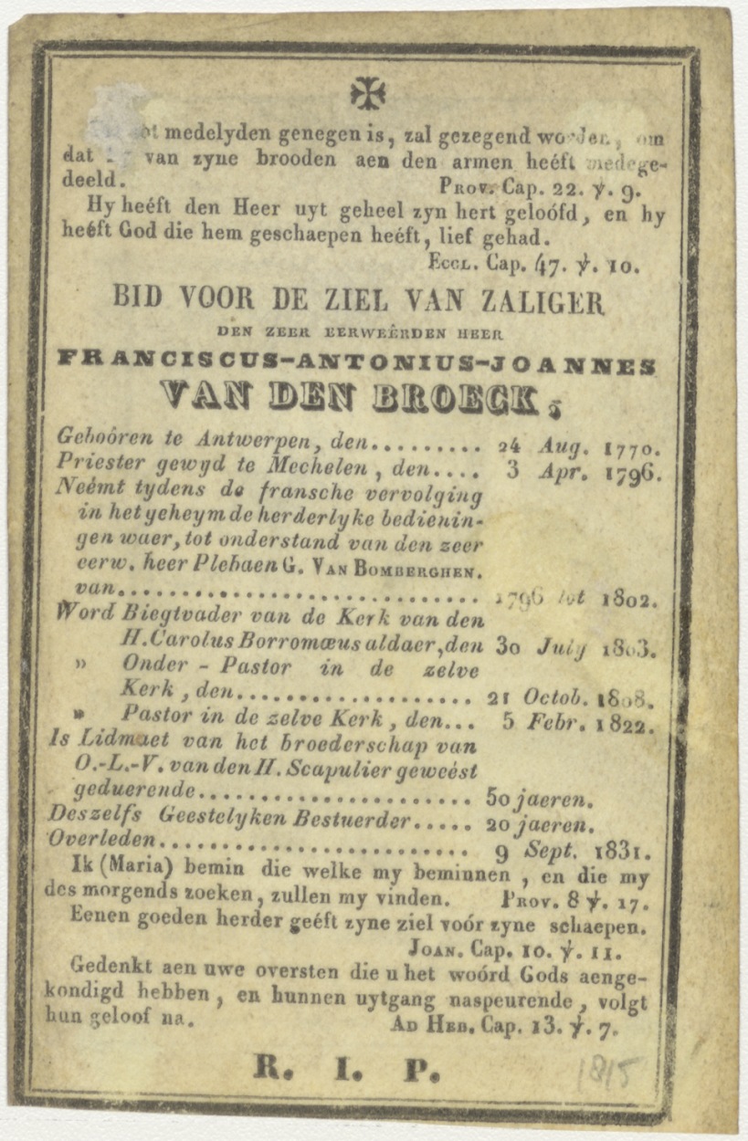 Twee Jezuïeten(?) zien visioen voor altaar, kz. Religieus;Bid voor ziel Franciscus van den Broeck (+1831);pastoor H. Carolus Borromeus;Mechelen;