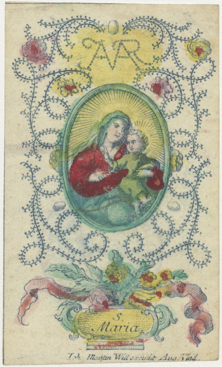 Maria met Christuskind, ingekleurd, kz. Bid voor ziel Hendricus Versteegen en Bid voor ziel Maria Lunenburg, overleden aan den Leidschendam, dubbelgebruik