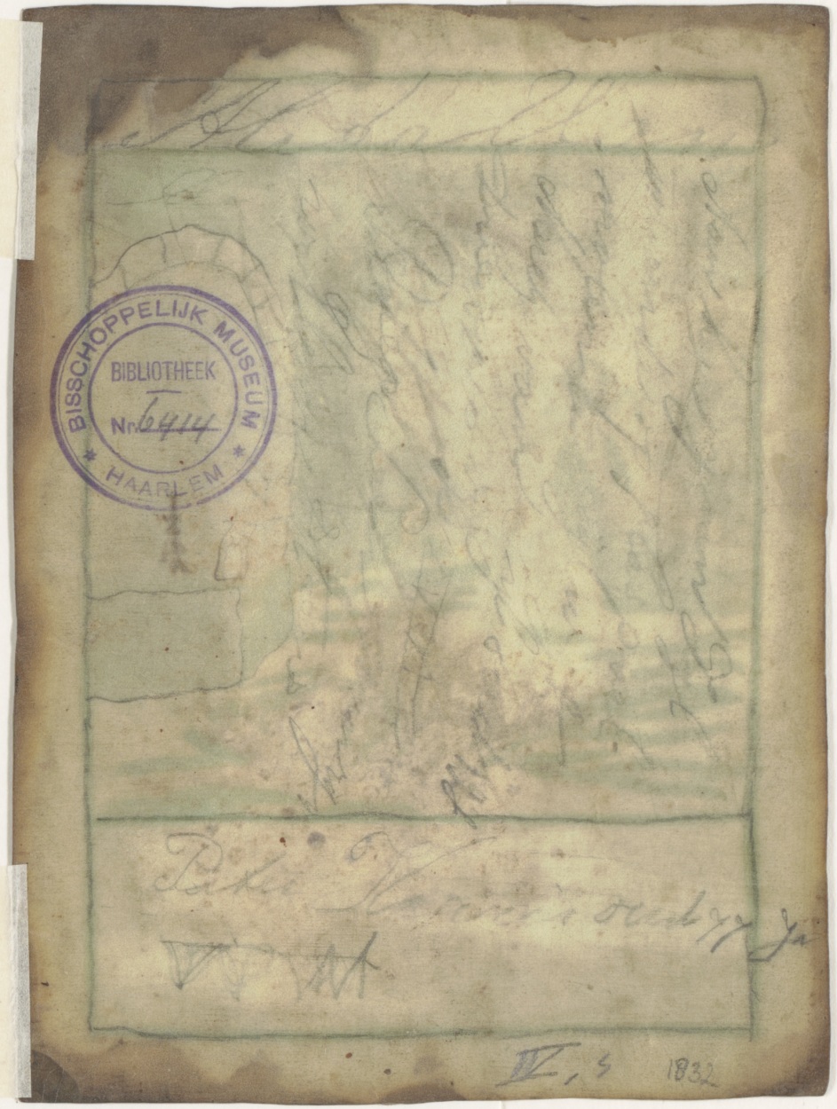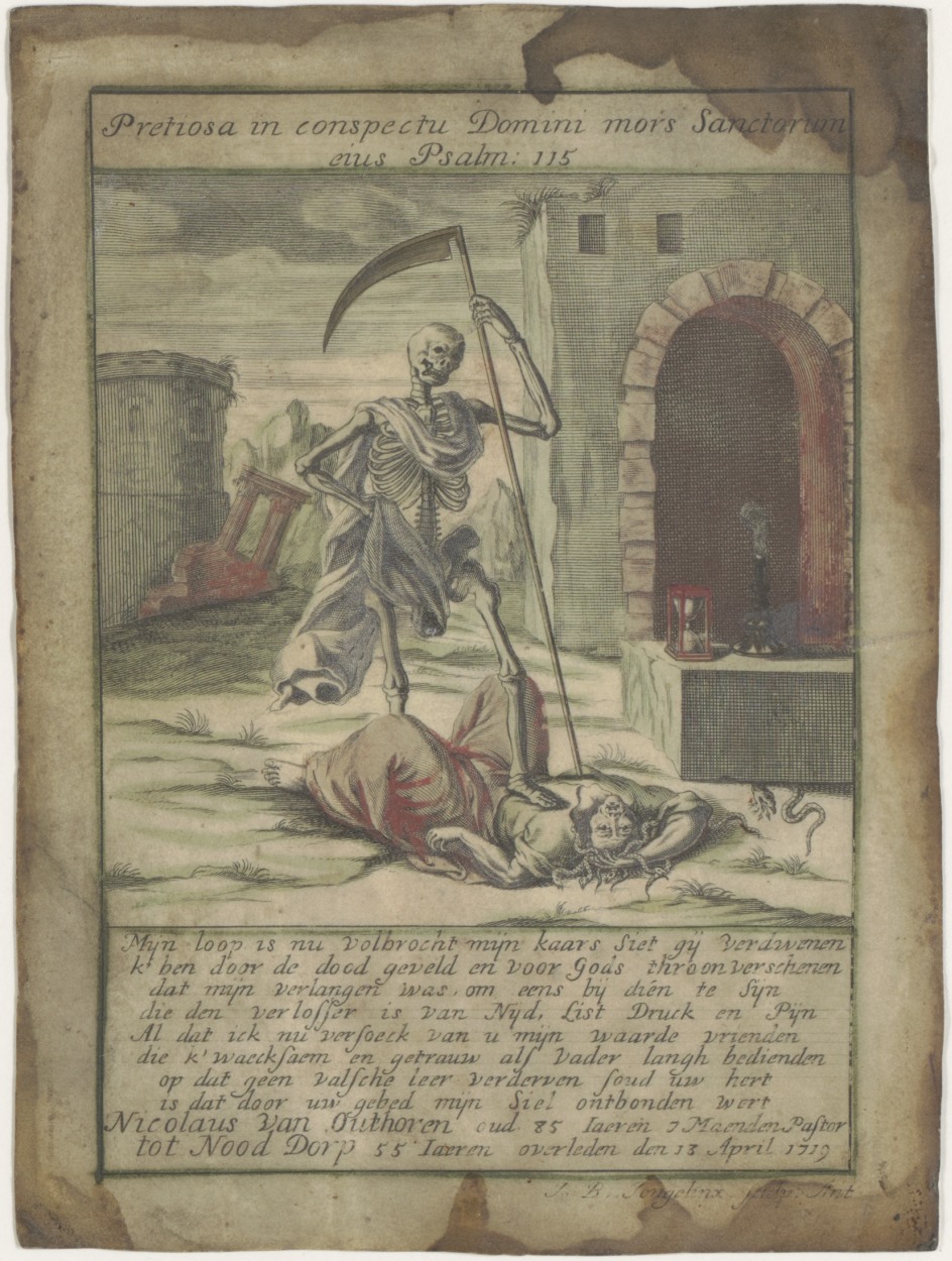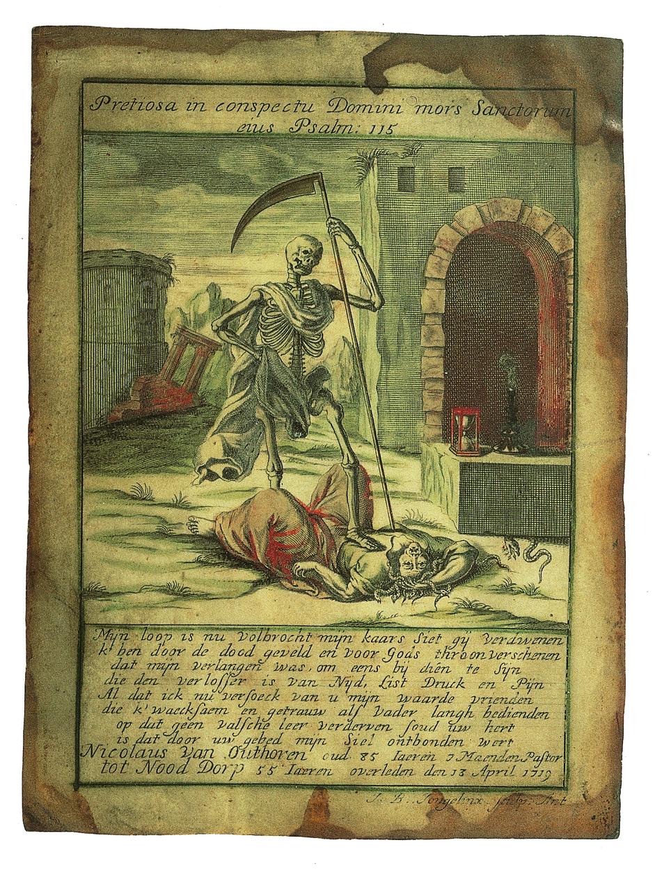 Dood (skelet) overwint het leven, ingekleurd, kz. Religieus;Nicolaus van Outhoven (+1719);pastoor tot Nooddorp (voorzijde)