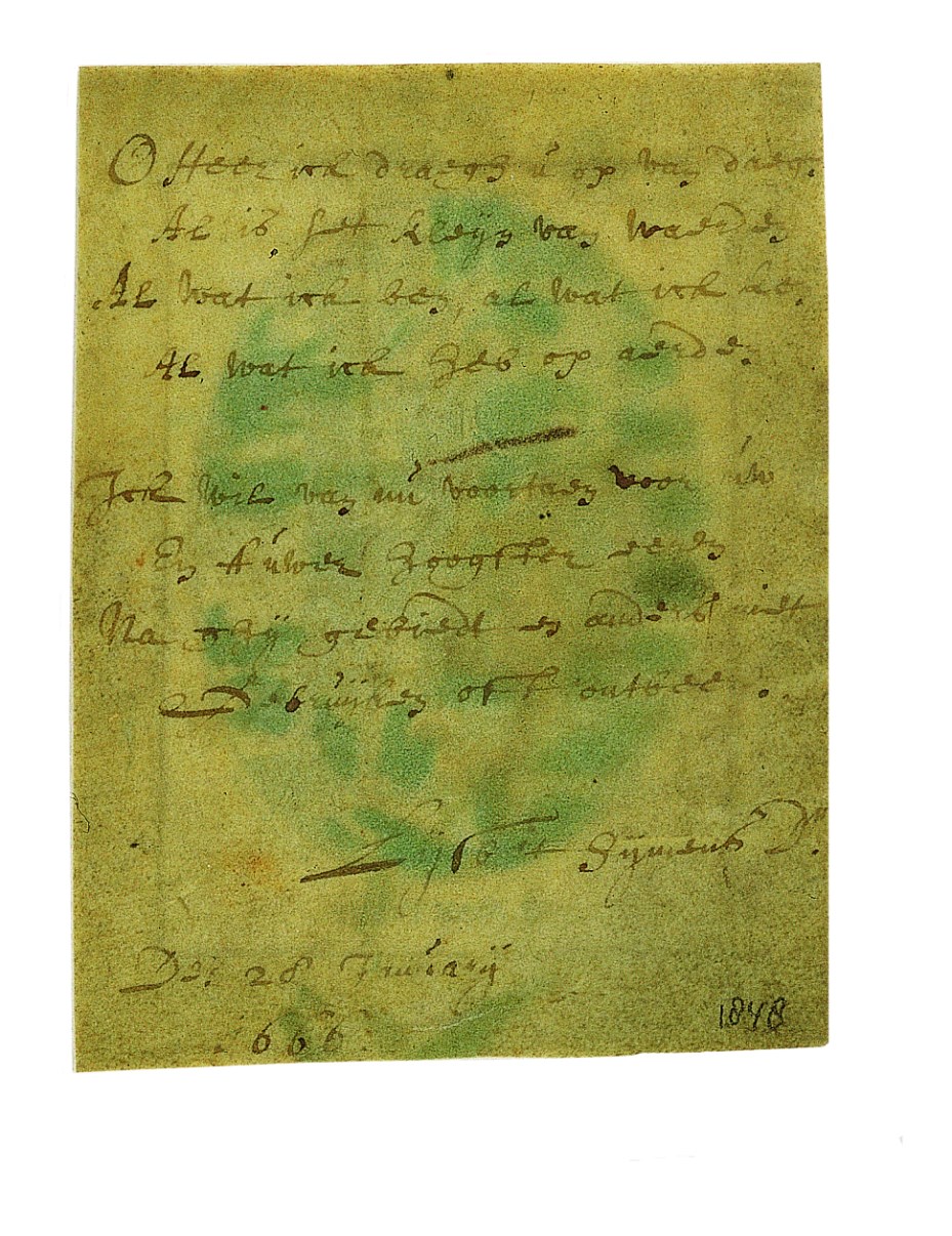 Op de keerzijde de tekst: O Heer ick draagh U op vandaag Al is het kleyn van waerden Al wat ick ben, al wat ik ken Al wat ik heb op aerden Ick wil van nu voortaen voor uw En al uwen hoogsten vereren Na ghij gebiedt en anders niet De bruyden [?] oft ontbeert ...