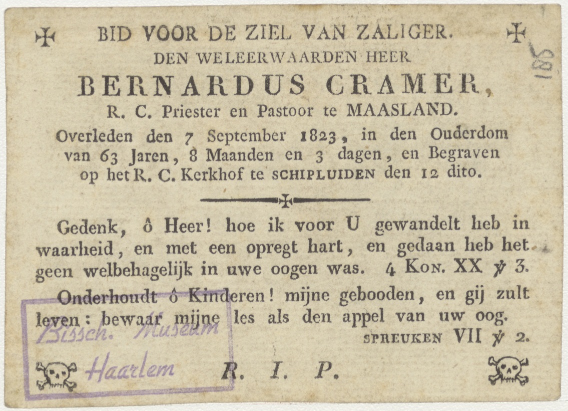 Pater Noster, Onze Vader, kz. Religieus;Bid voor ziel Bernardus Cramer (+1823); R.K. Maasland;R.K. kerkhof te Schipluiden