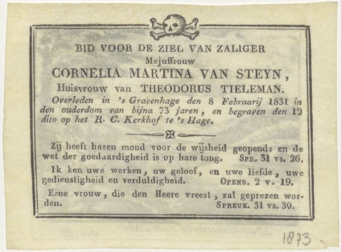 Dankbaarheid van Noë (Gen.9), kz. Bid voor ziel Tieleman-Van Steyn (+1831);Den Haag;