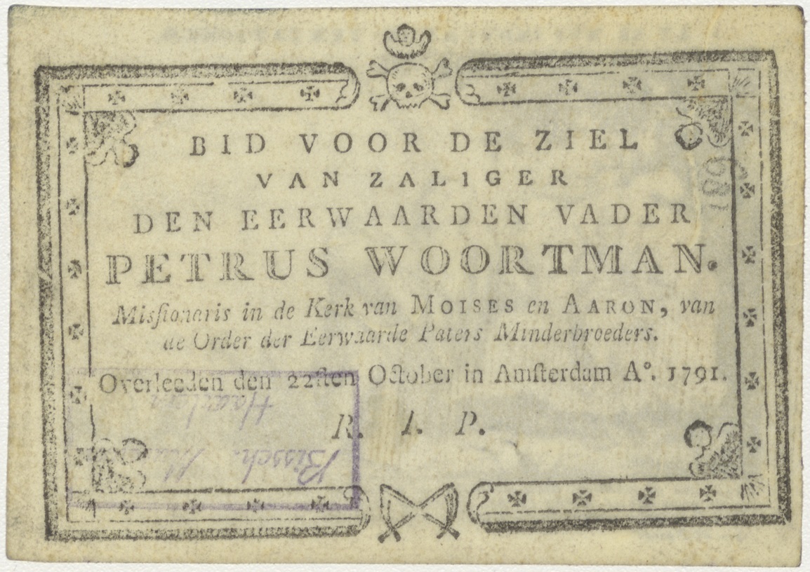 Psalm (24:2) Man met Duivel(?), des Heren is de Aarde en haar volheid(?), kz. Religieus;Bid voor ziel Petrus Woortman (+1791);missionaris Mozes en Aaron Amsterdam;