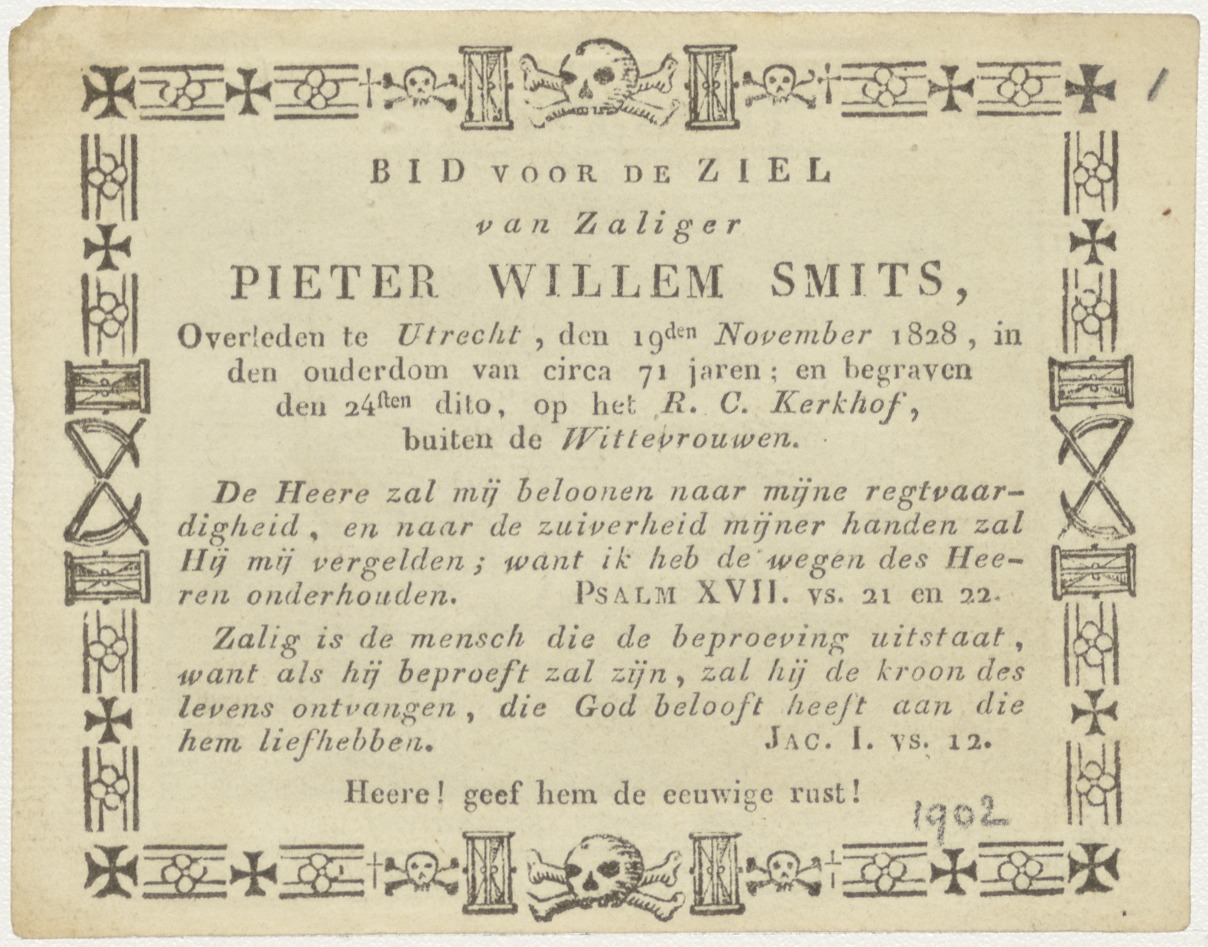 Voorteeken over Jeruzalem (2 Makk.1:4), kz. Bid voor ziel Smits (+1828);Utrecht;