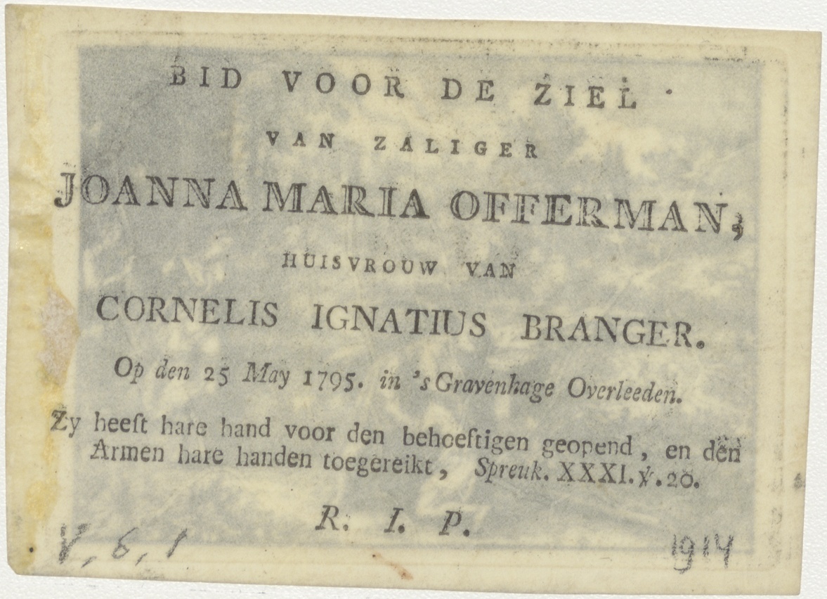 Terugkeer van de verloren zoon, kz. Bid voor ziel Branger-Offerman (+1795);'s-Gravenhage;