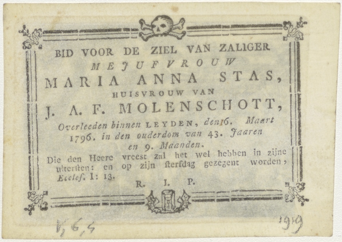 Wonder van Christus: de wonderbaarlijke broodvermenigvuldiging, kz. Bid voor ziel Molenschott-Stas (+1796);Leiden;
