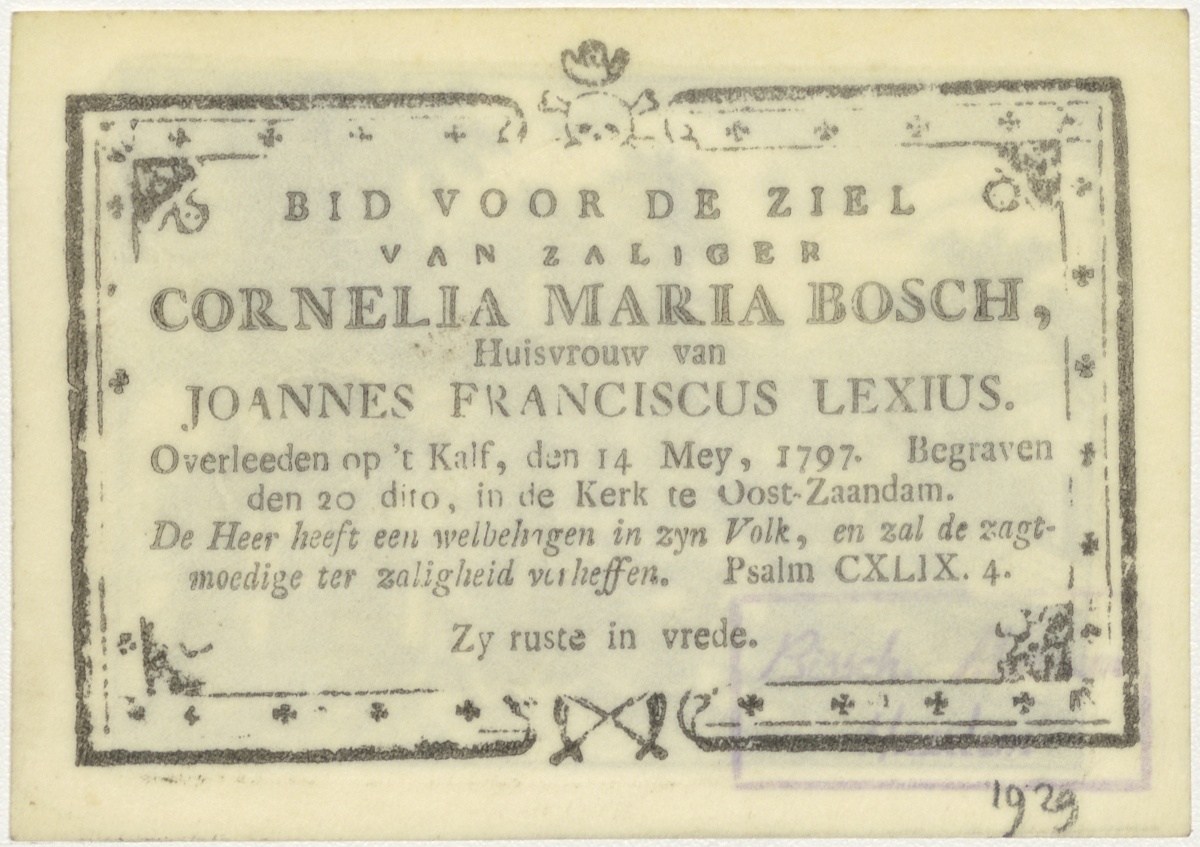Christus wijst naar man(?), kz. Bid voor ziel Cornelia Maria Bosch (+1797), 't Kalf, begraven te Oost-Zaandam, huisvrouw van Joannes Franciscus Lexius