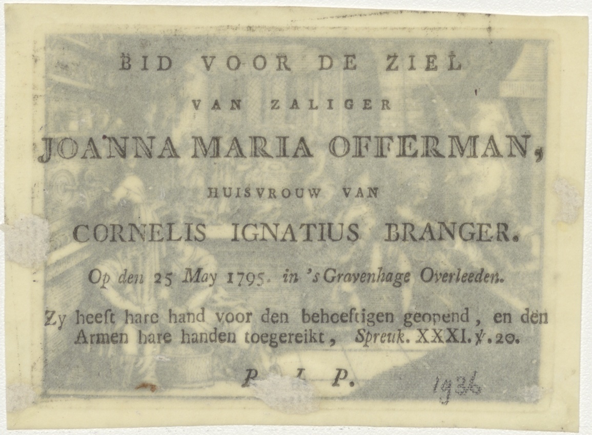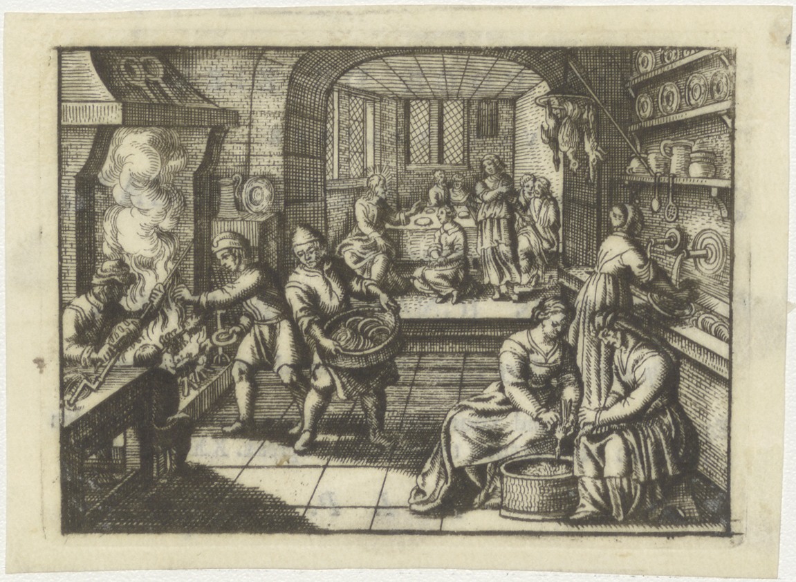 Christus spreekt tijdens de maaltijd, met keukenscène, kz. Bid voor ziel Branger-Offerman (+1795);'s-Gravenhage;