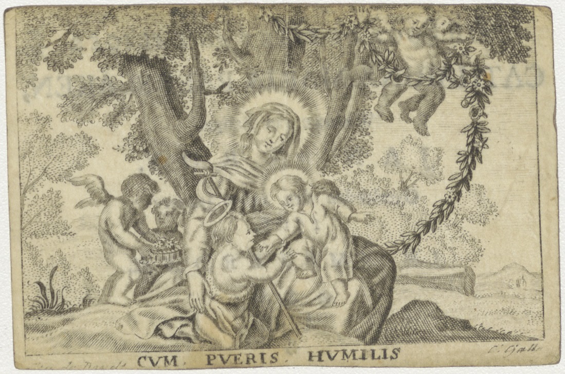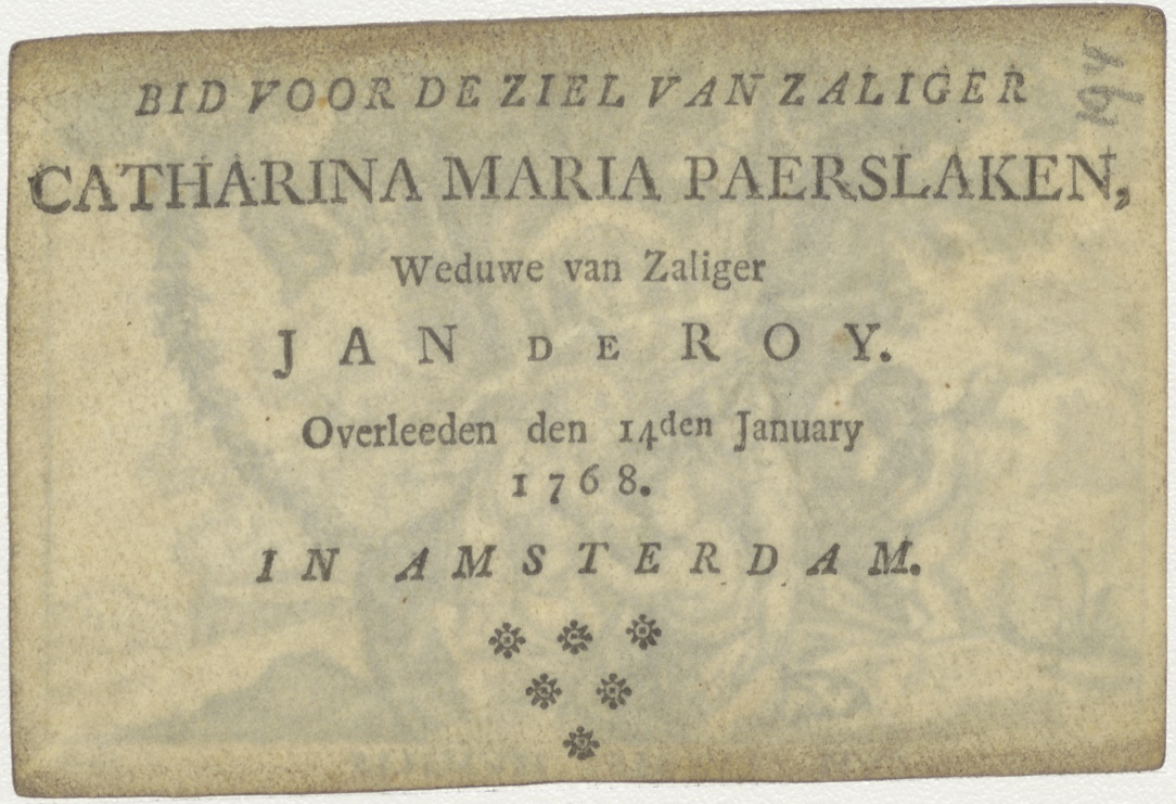 Maria met Christuskind en Johannes, kz. Bid voor ziel Catharina Maria Paerslaken (+1768), Amsterdam, weduwe van Jan de Roy
