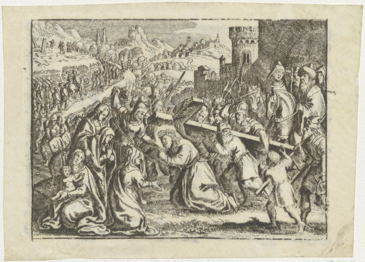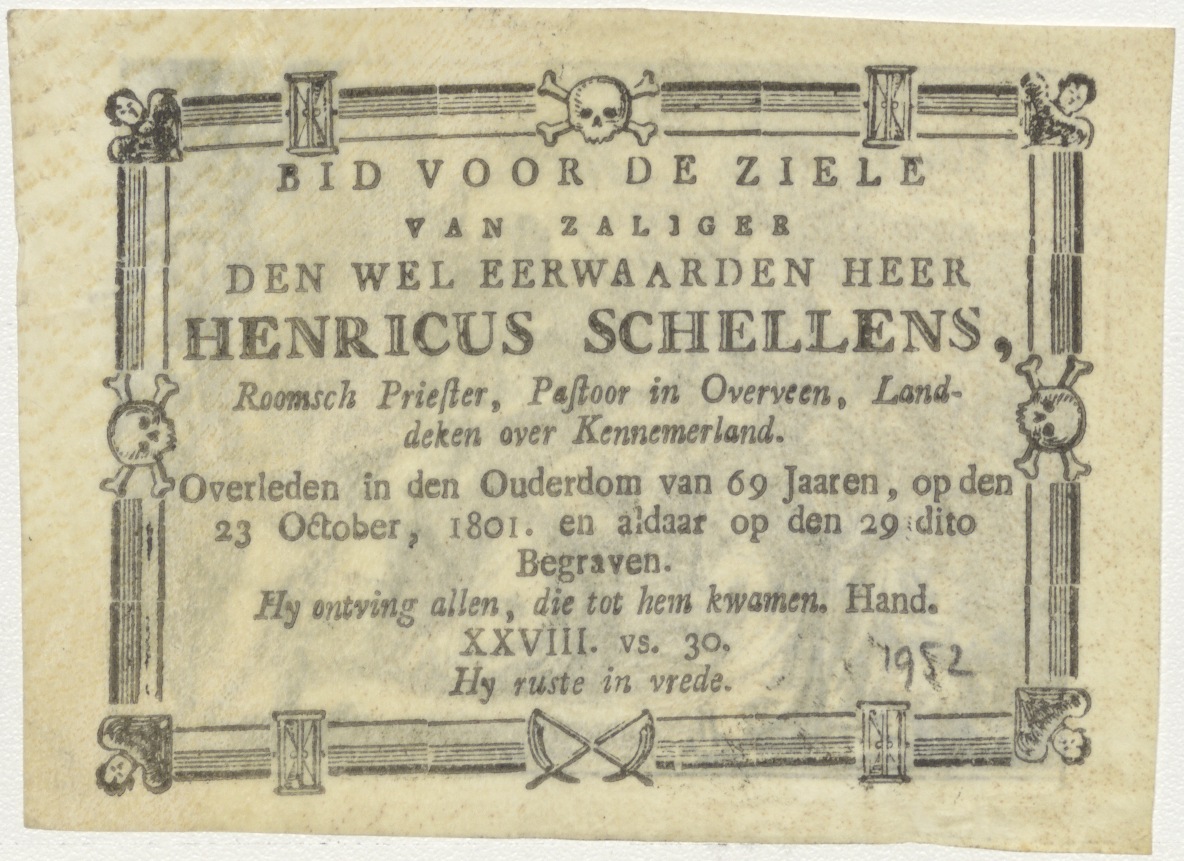 Passiescène: Val van Christus onder het kruis, kz. Religieus;Bid voor ziel Henricus Schellens (+1801);pastoor te Overveen;