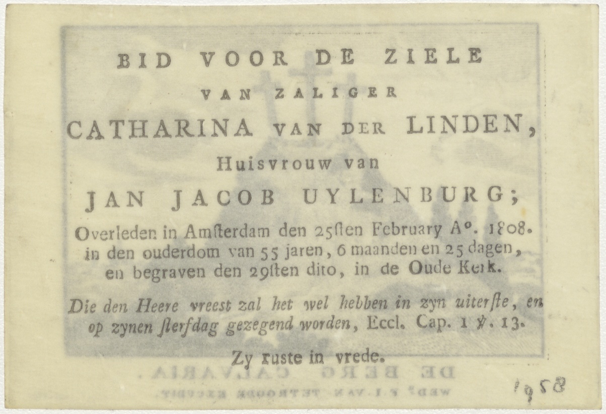 Berg Calvaria, Calvarieberg met kruis van Christus, kz. Bid voor ziel Uylenburg-Van der Leiden (+1808);Amsterdam;