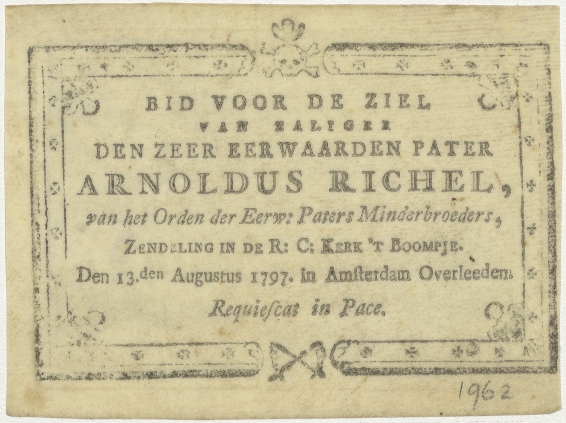 Zaaier, kz. Religieus;Bid voor ziel Arnoldus Richel (+1797);kerk 't Boompje;Amsterdam;