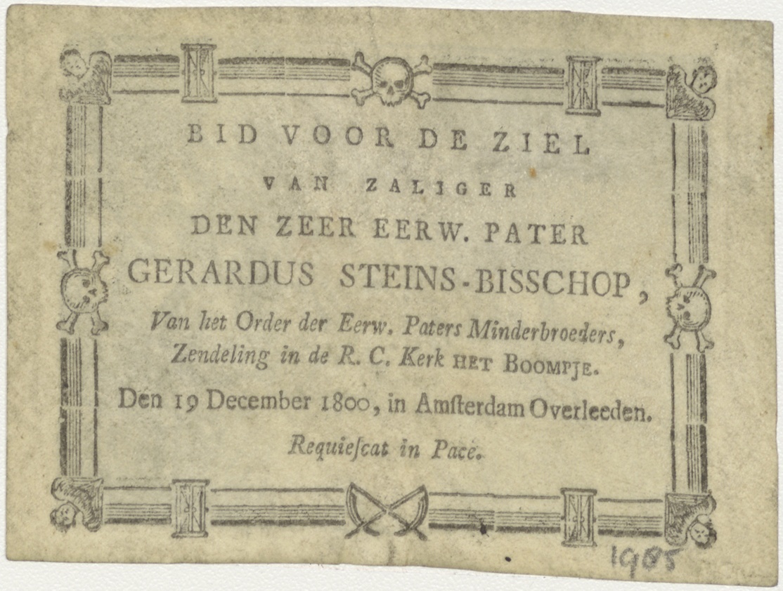 Nederdaling van de H. Geest, kz. Religieus;Bid voor ziel Gerardus Steins-Bisschop (+1800);zendeling kerk Het Boompje;