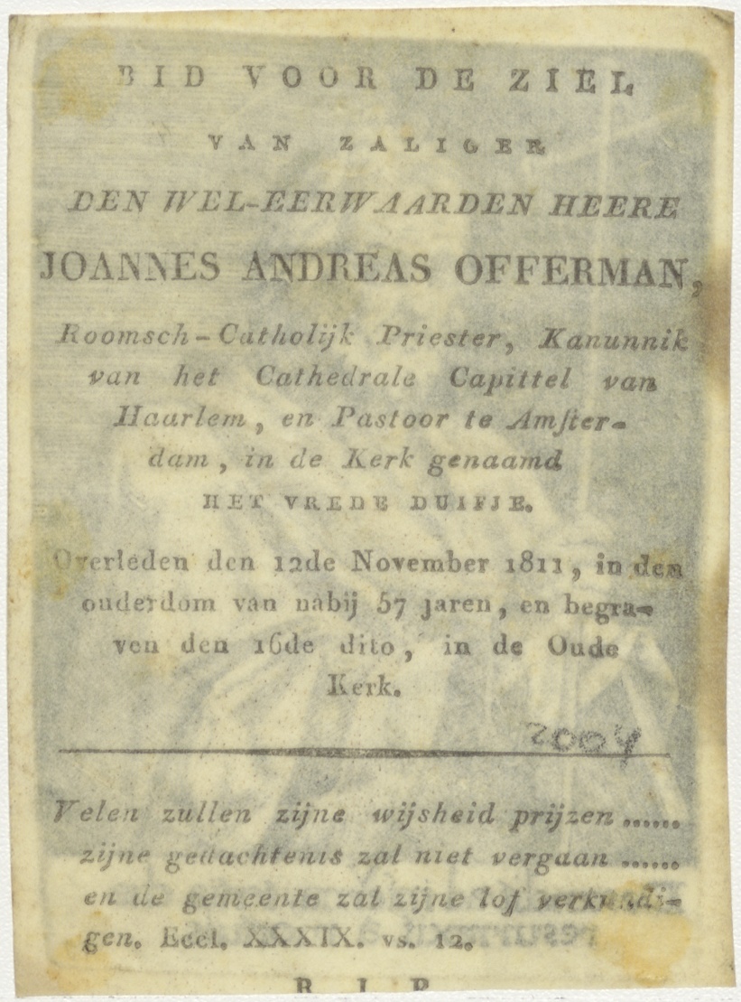 Jacobus Minor(?), kz. Religieus;Bid voor ziel Joannes Offerman (+1811);kanunnik Haarlem;pastoor het vrede duifje;