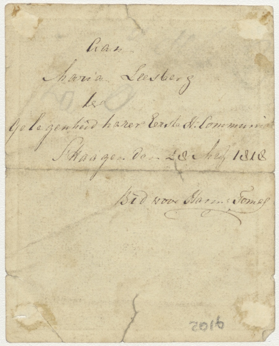 Het leven der Heilige Maagd Maria (serie): 5. Opoffering van Maria in den tempel, ingekleurd, kz. H. Communie Leesberg;1818;Den Haag;door pastoor Harm Thomes(?);