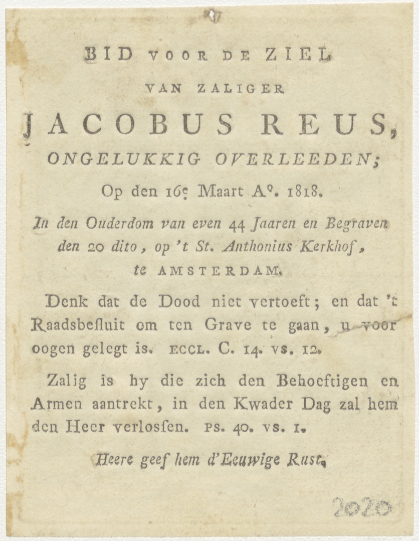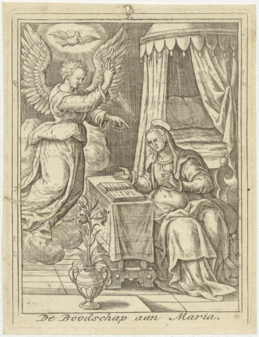Het leven der Heilige Maagd Maria (serie): 7. Annunciatie, Maria boodschap, kz. Bid voor ziel Jacobus Reus (+1818);Amsterdam;