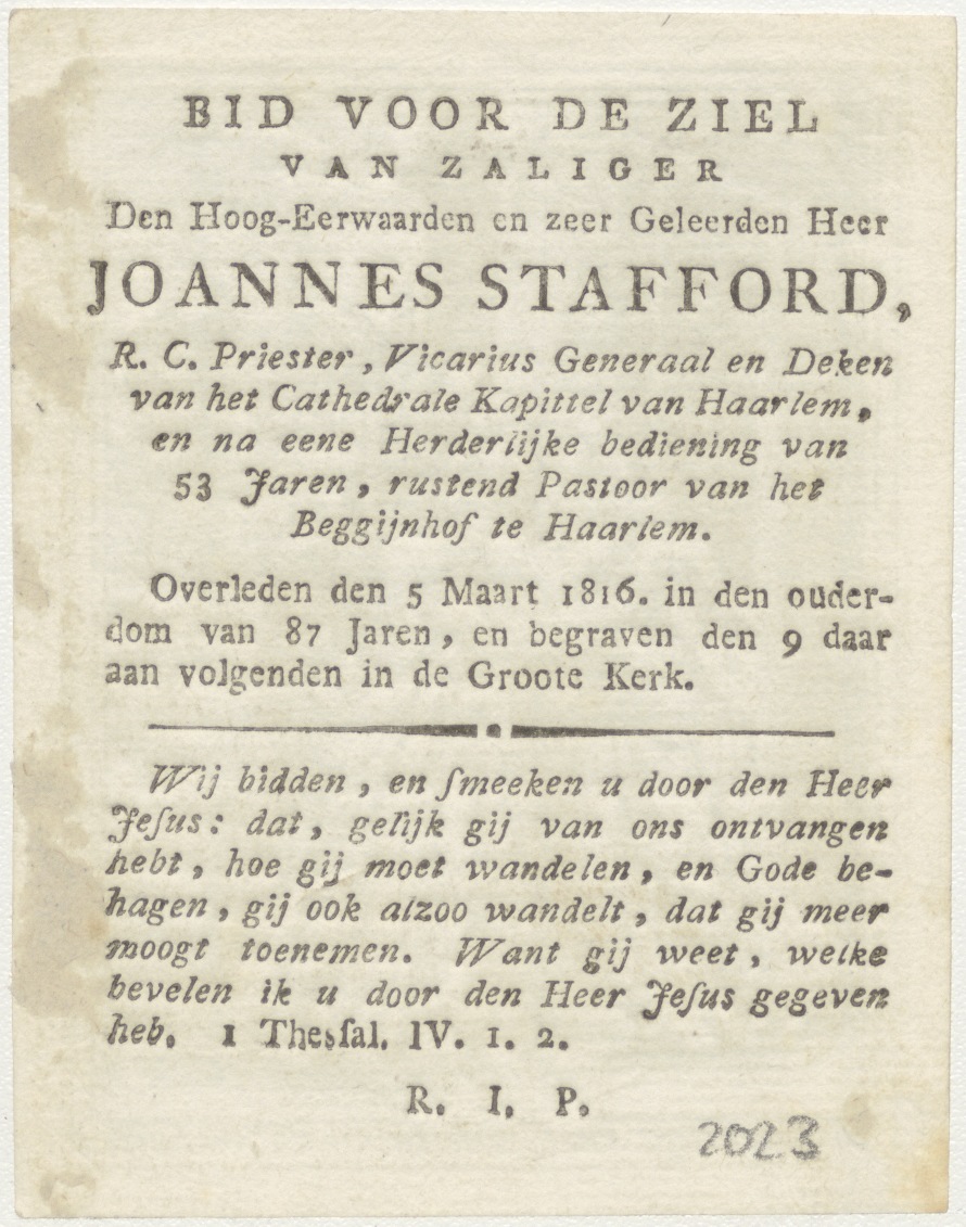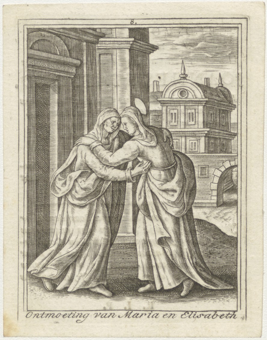 Het leven der Heilige Maagd Maria (serie): 8. Visitatie, ontmoeting van Maria en Elisabeth, kz. Religieus;Bid voor ziel Joannes Stafford (+1816); kanunnik Haarlem;pastoor Begijnhof Amsterdam