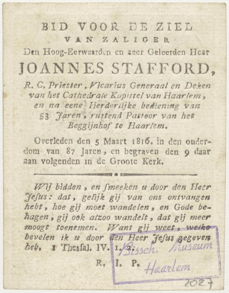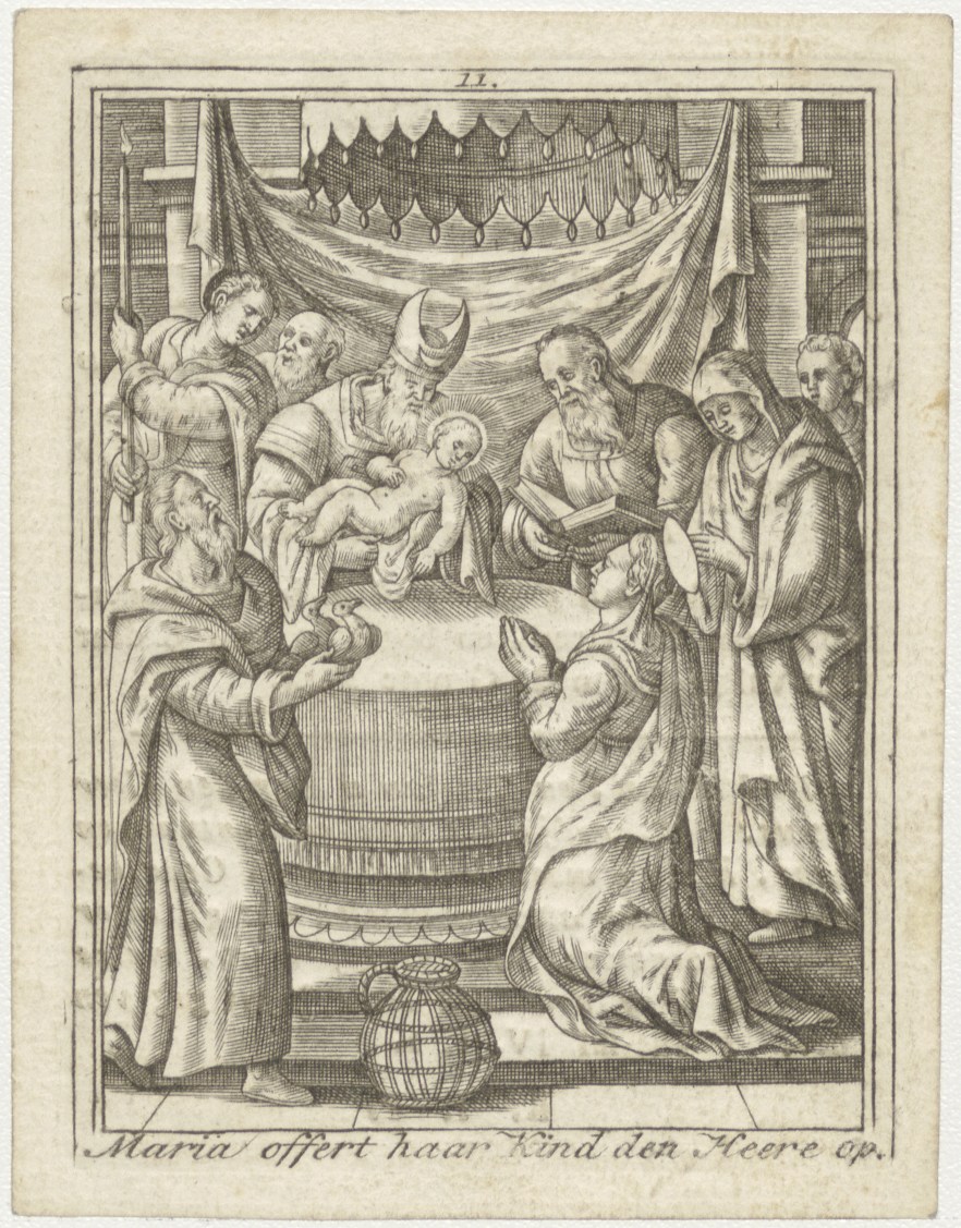 Het leven der Heilige Maagd Maria (serie): 11. Maria offert haar kind den Heere op, kz. Religieus;Bid voor ziel Joannes Stafford (+1816);kanunnik Haarlem;pastoor Begijnhof;